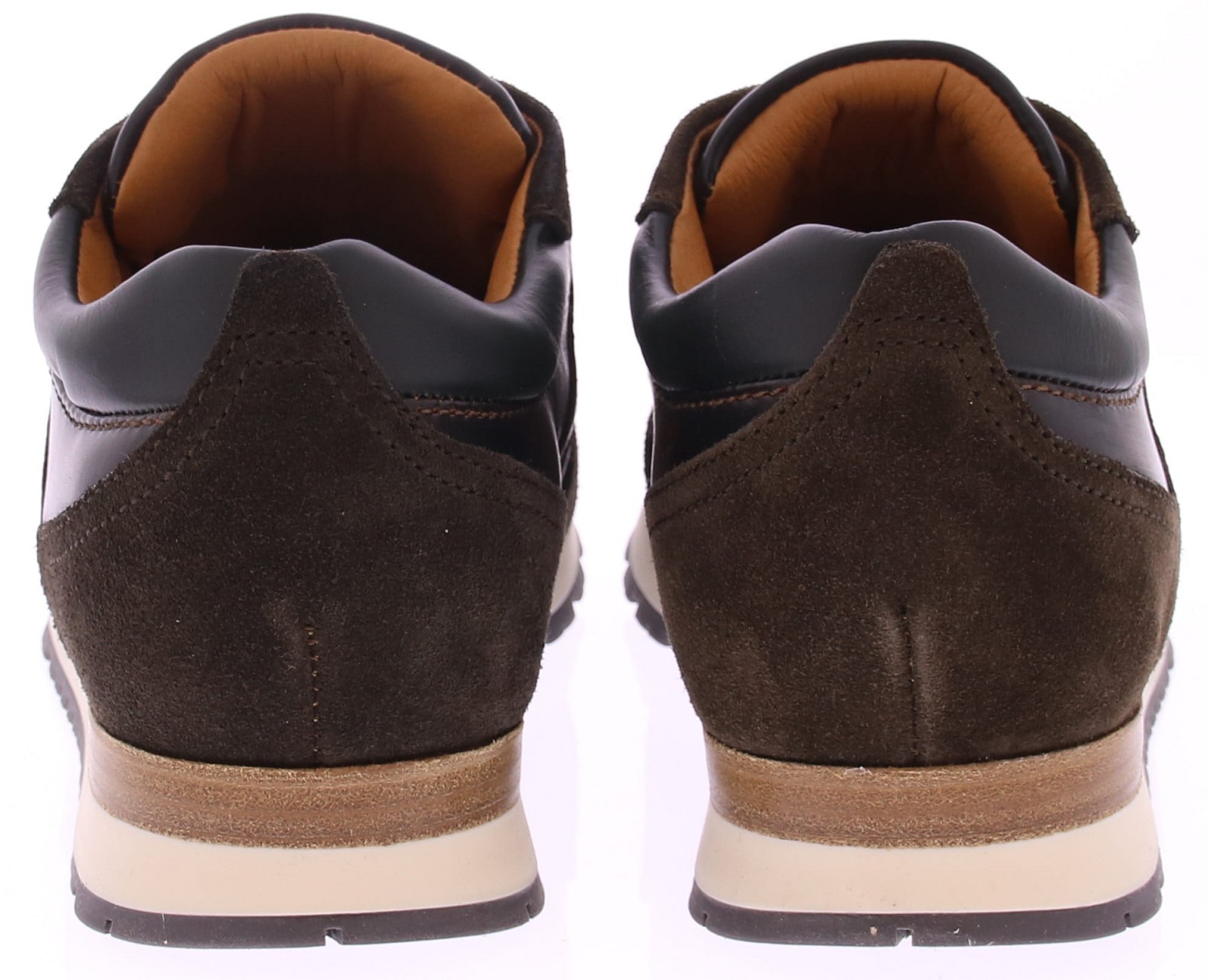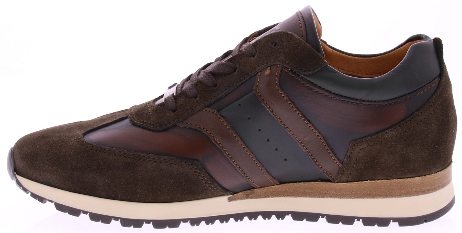 Donkerbruin leer met suede heren sneaker van Rapidsoul. deze heren sneaker in donkerbruin combineert stijl met karakter. Het leren bovenwerk is voorzien van een opvallend vlak met een subtiel vlameffect, wat de schoen een unieke uitstraling geeft. Dankzij de leren voering en duurzame rubberenzool biedt deze sneaker zowel comfort als kwaliteit voor dagelijks gebruik.