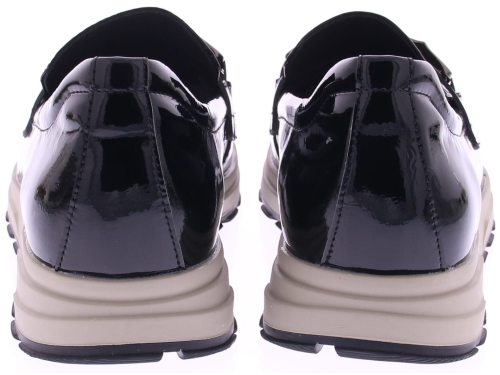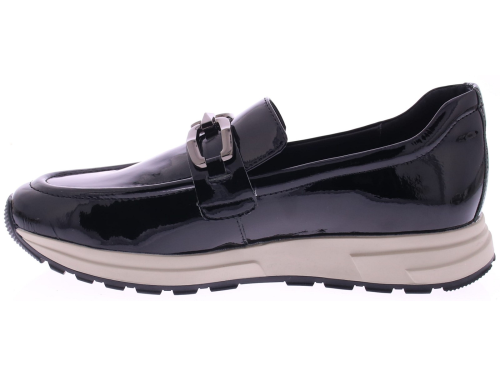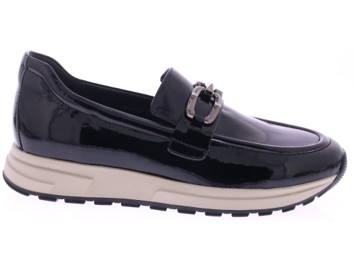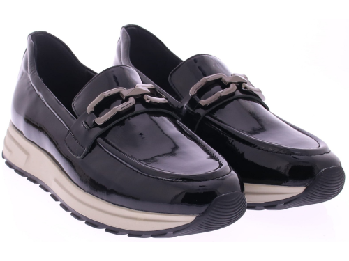 Sportieve zwart lakleren dames loafer van Rapid Soul. De Yza is een trendy loafer in lakleer met een antraciet metalen bit op een sportieve sneakerzool van rubber wat zorgt voor optimale grip.