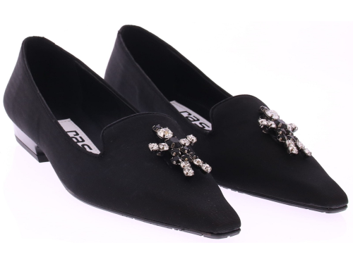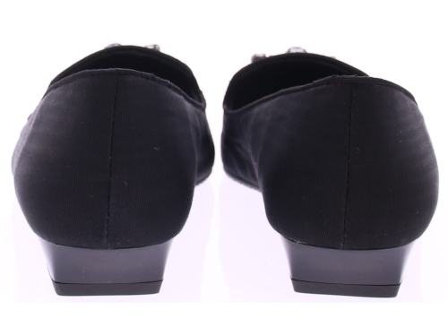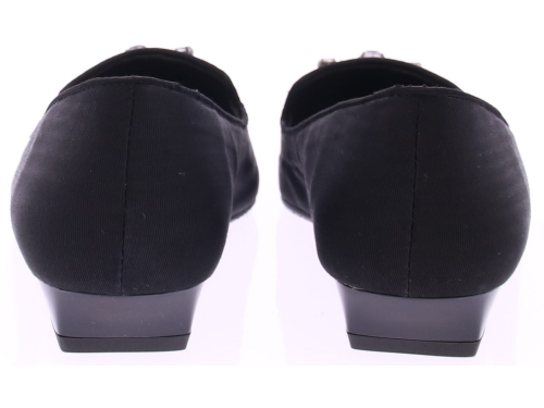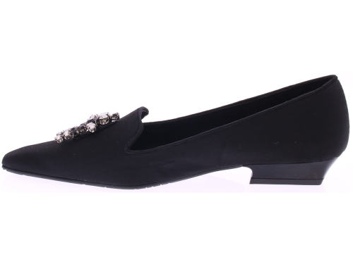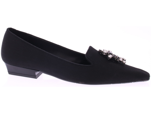 Zwart stoffen dames instapper van Ras. Deze schoen is uitgevoerd in zwart stof en voorzien van een verfijnde spitse leest. Opvallend detail is het speelse straspoppetje op de wreef. De subtiele hak van 2 cm biedt net dat beetje extra verfijning zonder in te leveren op comfort. Deze loafer is perfect voor wie houdt van klassiek met een twist – stijlvol, origineel en moeiteloos draagbaar van dag tot avond.