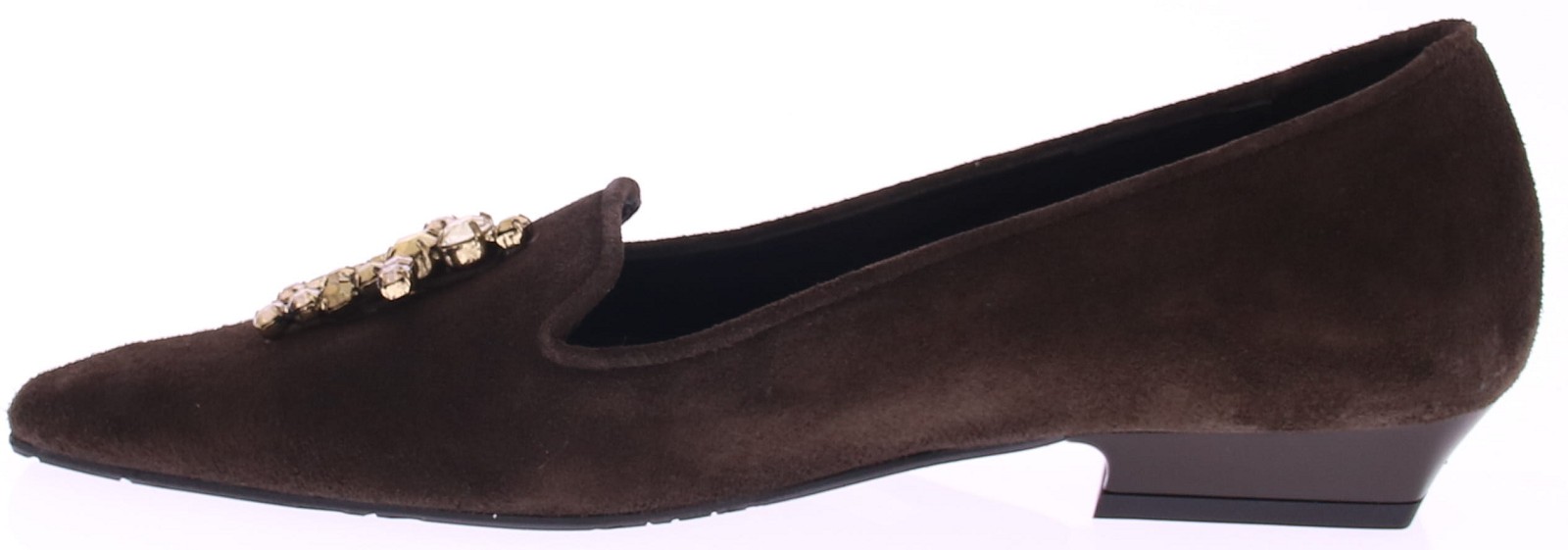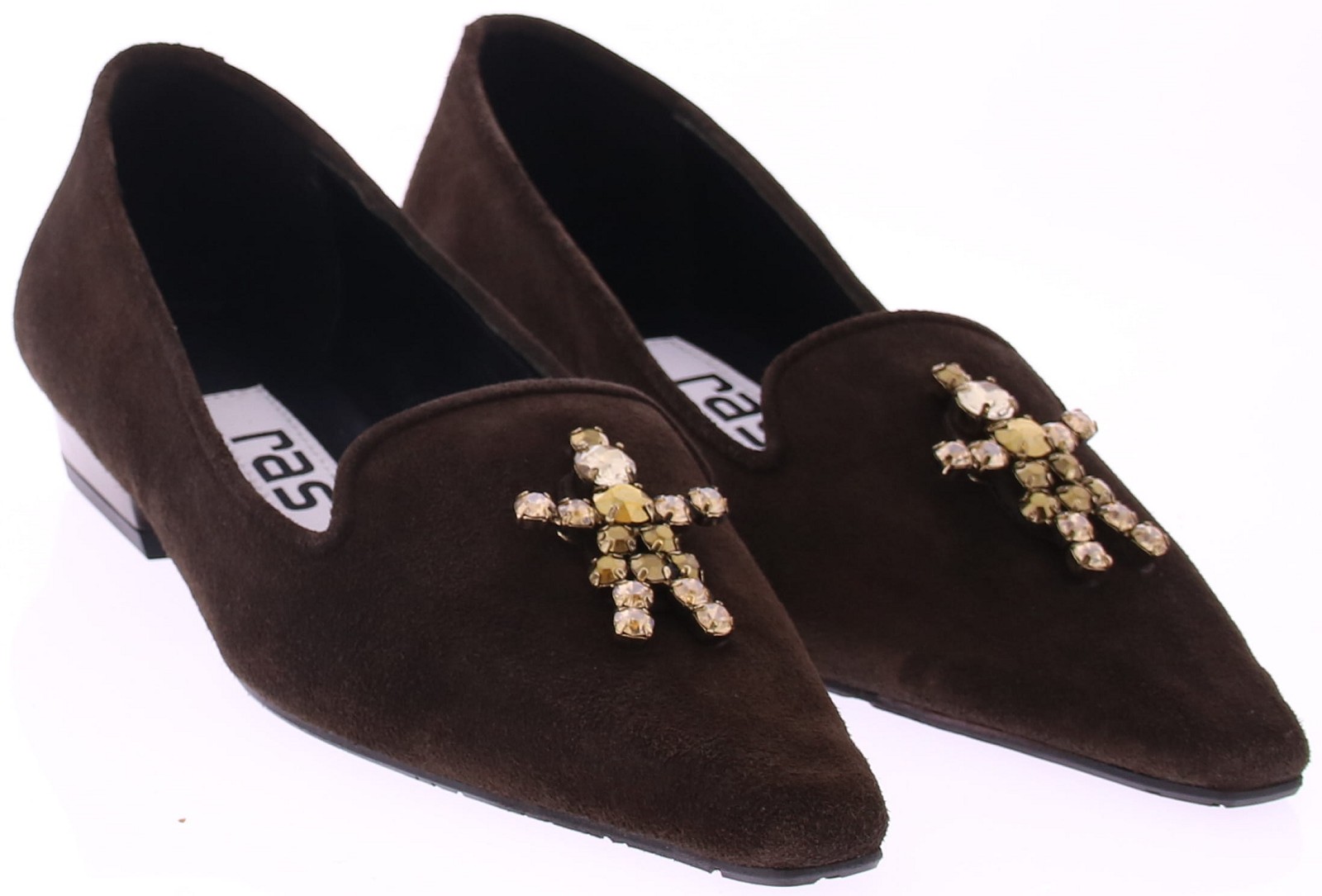 Donkerbruin suéde dames instapper van Ras. Deze schoen is uitgevoerd in donkerbruin suéde en voorzien van een verfijnde spitse leest. Opvallend detail is het speelse straspoppetje op de wreef. De subtiele hak van 2 cm biedt net dat beetje extra verfijning zonder in te leveren op comfort. Deze loafer is perfect voor wie houdt van klassiek met een twist – stijlvol, origineel en moeiteloos draagbaar van dag tot avond.