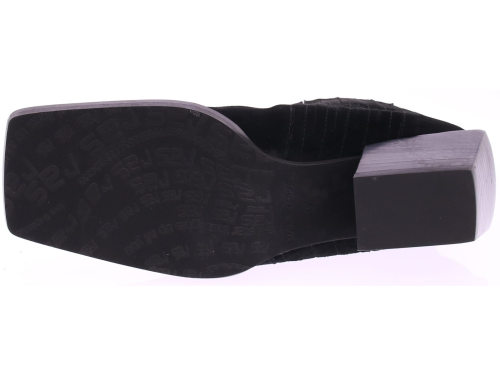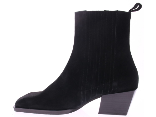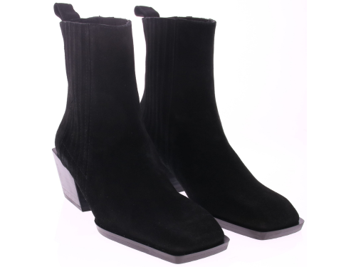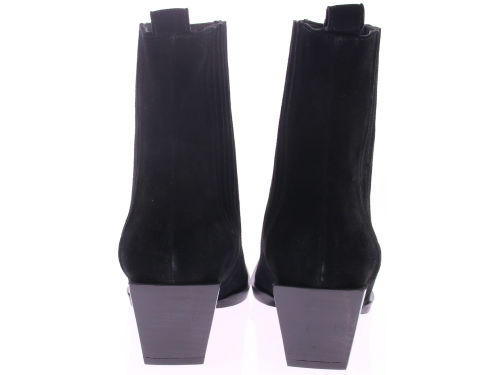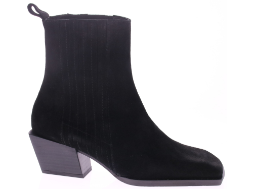 Zwart suéde dames korte laars van Ras. Deze laars is voorzien van elastiek aan de zijkant waardoor de laars goed aansluit om de enkel, en trek je ze gemakkelijk aan dankzij de praktische lus aan de hiel. De iets schuine blokhak van 6 cm geeft een stoere look en zorgt tegelijk voor stabiel loopcomfort. Een veelzijdige laars die perfect past bij zowel een jeans als een rok – modern, vrouwelijk en moeiteloos draagbaar.