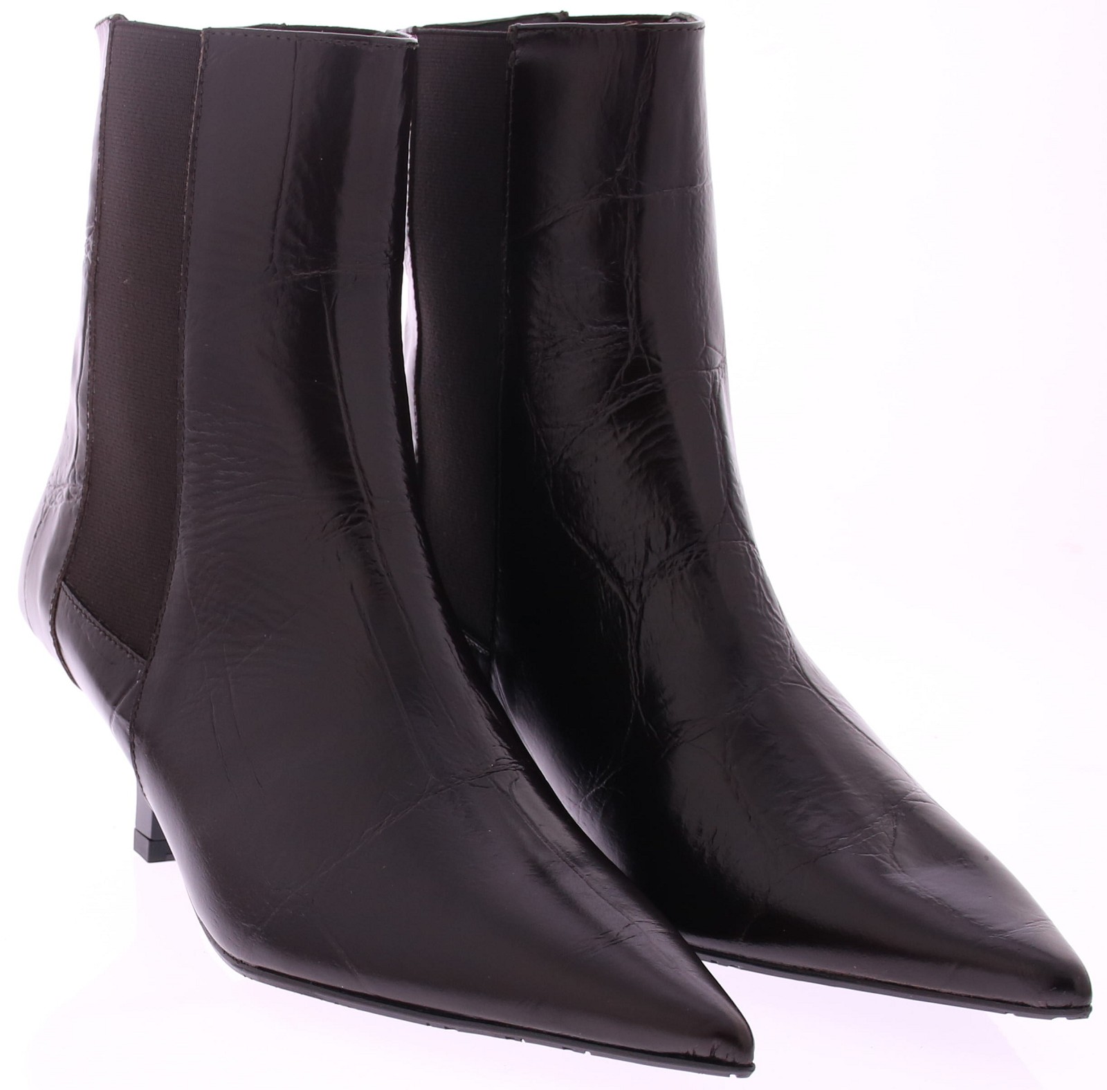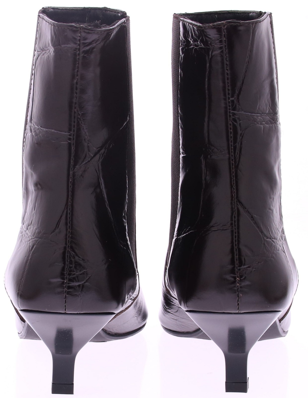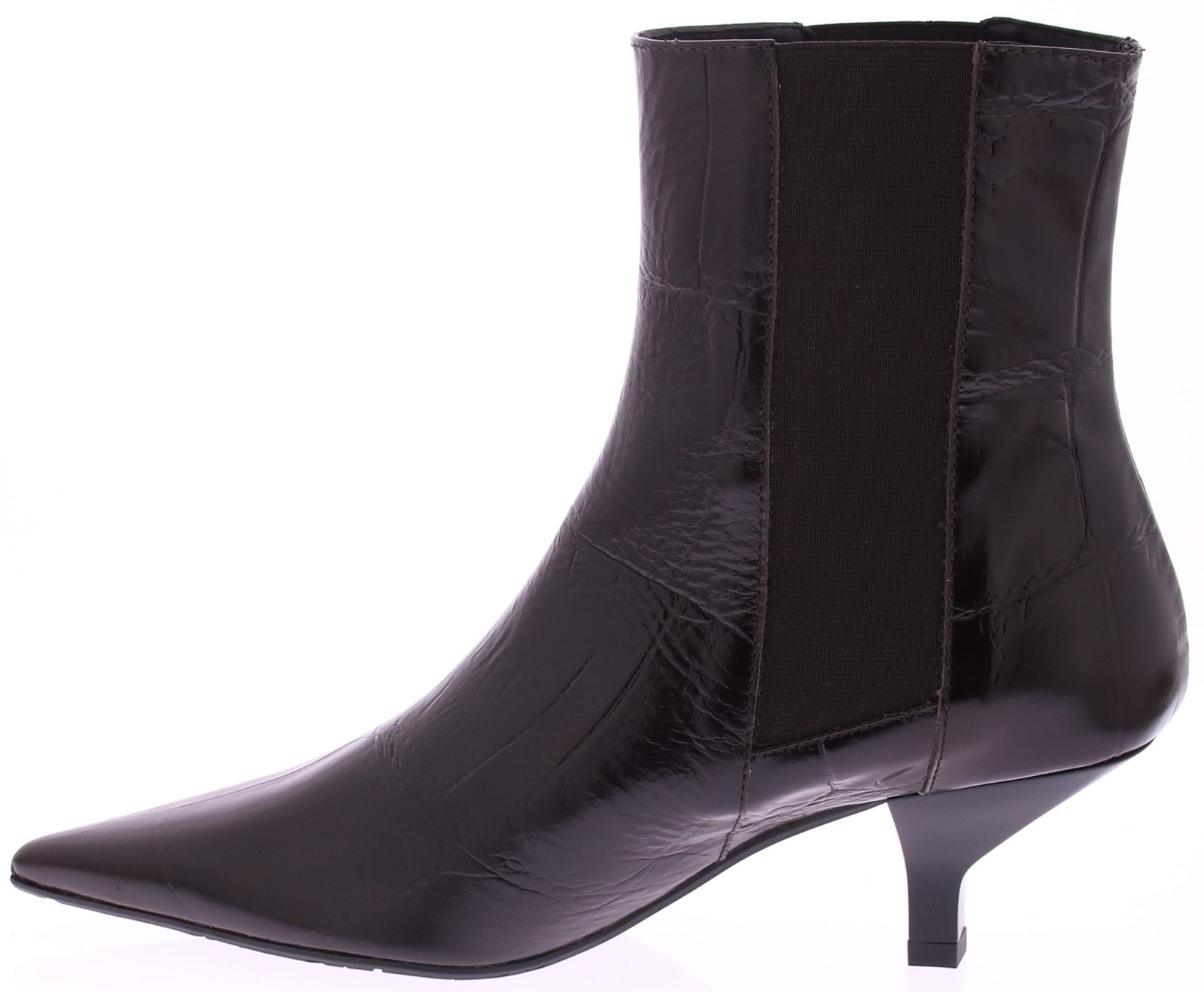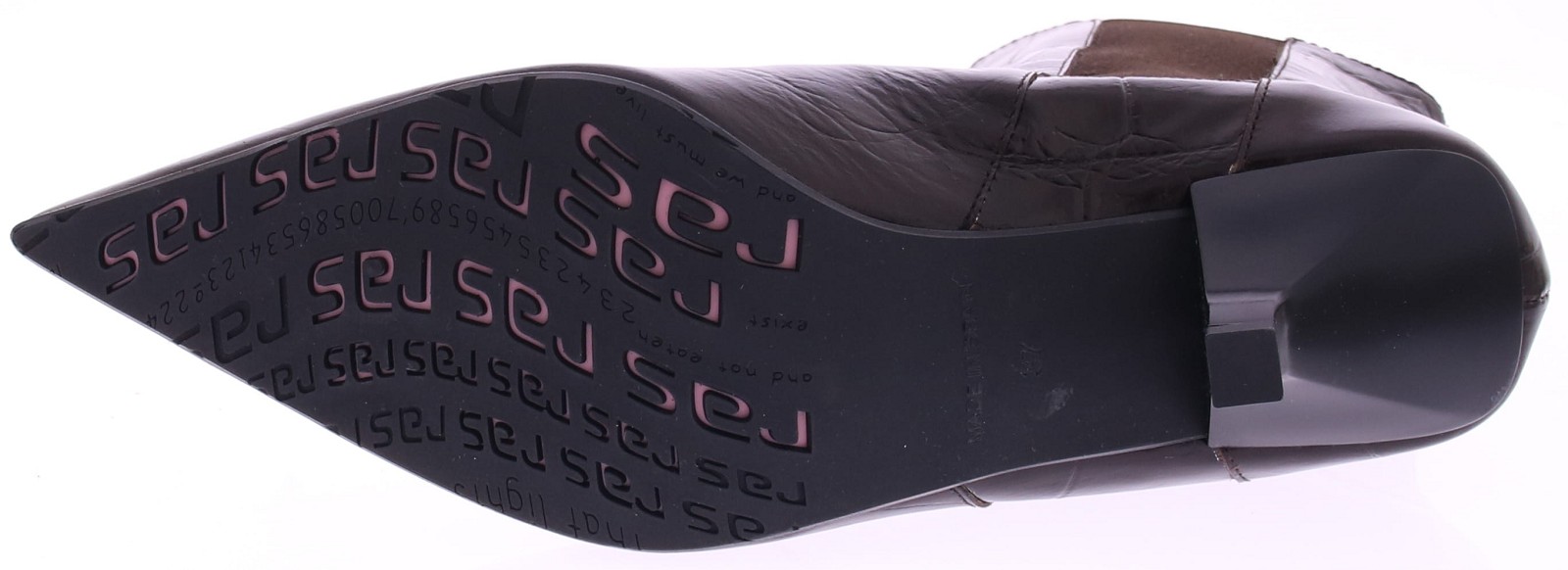 Donker bruin leren dames korte laars met crocoprint van het merk Ras. Deze laars heeft een spitse leest en een queenie hak van 5 cm. Dankzij de elastieke inzet aan beide zijkanten trek je het laarsje moeiteloos aan. Een veelzijdige laars die perfect past bij zowel een jeans als een rok – modern, vrouwelijk en moeiteloos draagbaar.