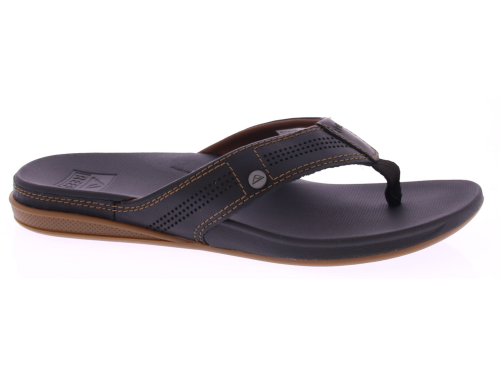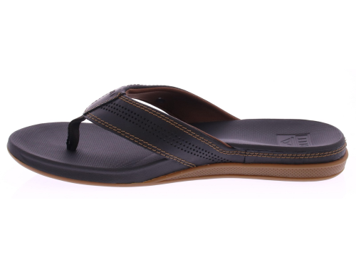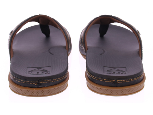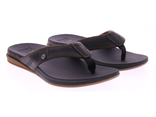 Zwarte heren teenslippers van het merk Reef. De Reef Cushion Lux teenslippers voor heren zijn slippers met ondersteuning in het voetbed voor extra comfort en heeft een gewatteerde leren voetband. Het voetbed is van zacht EVA en geeft ondersteuning en veert terug bij iedere stap.