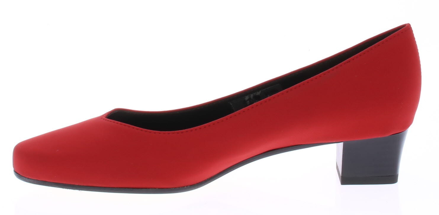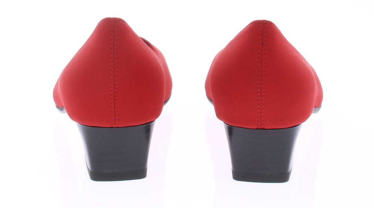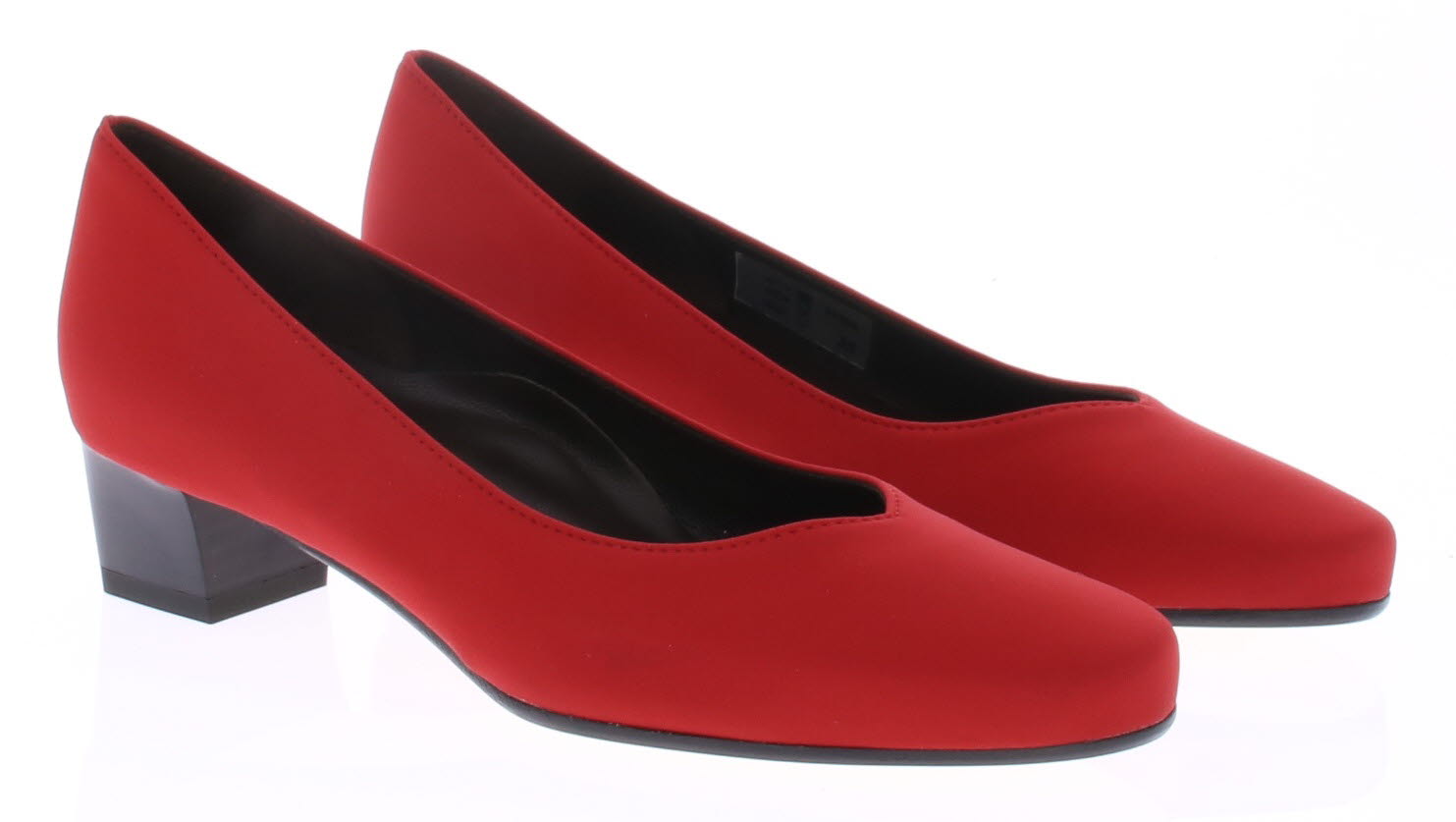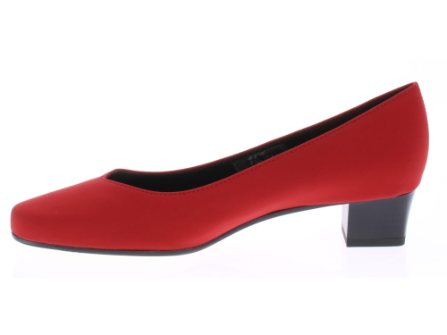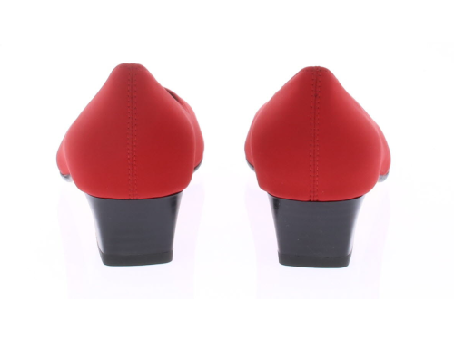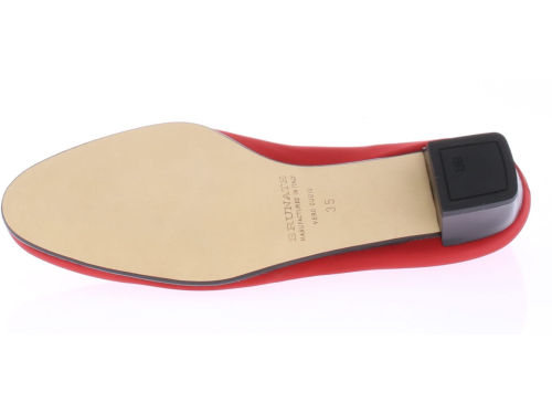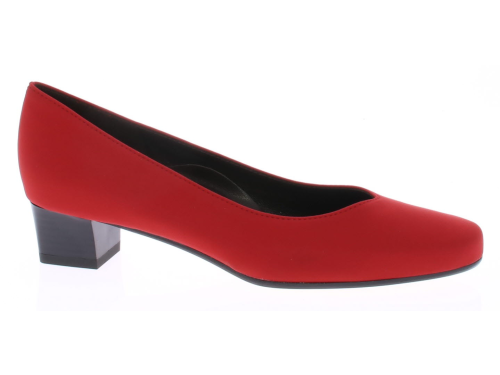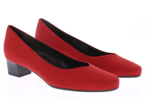 Rood stoffen dames pump van Brunate. De pump heeft een elegante V-uitsnijding op de voet, is volledig leer gevoerd en heeft een comfortabel 3 cm hakje.