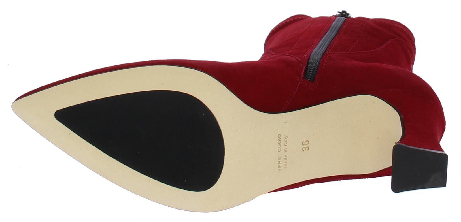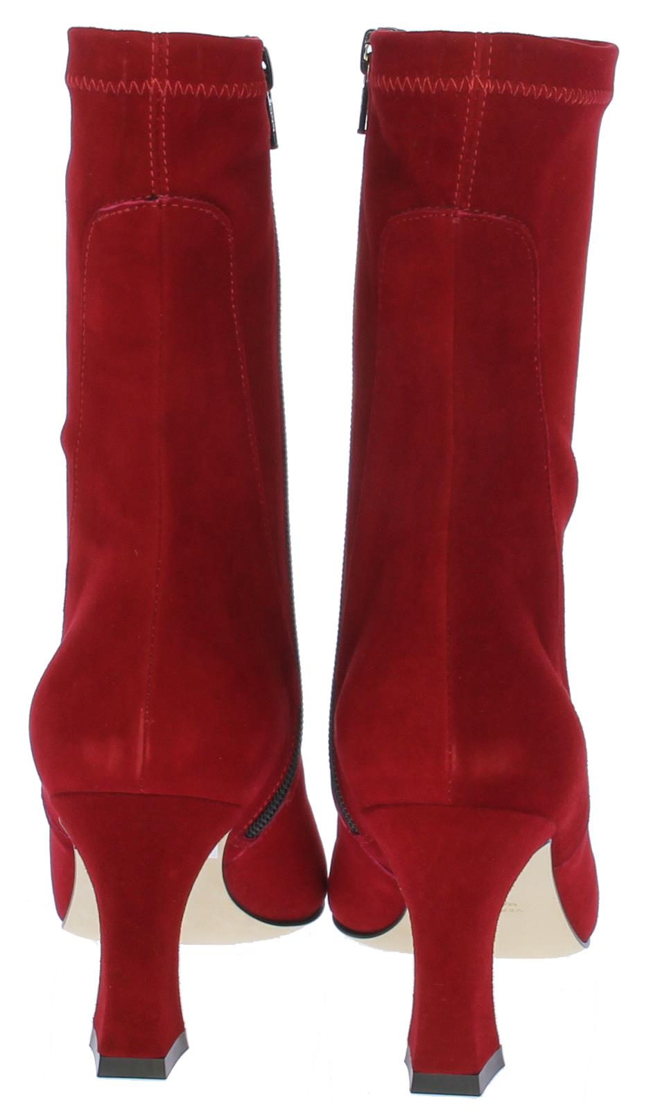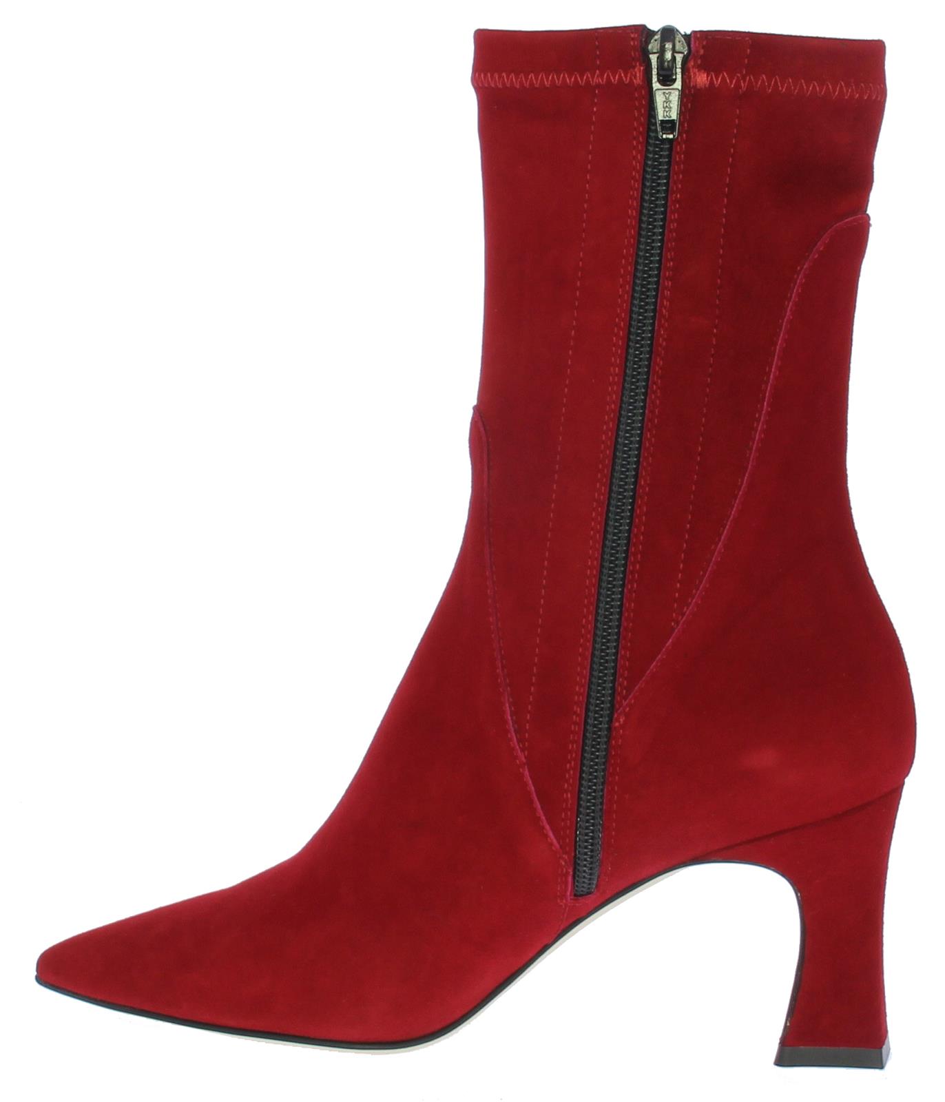 Rode suede driekwart dames enkellaars van Lilian. Deze laars heeft een spitsere neus. De beklede hak is iets uitlopend en heeft een hoogte van 7 cm.