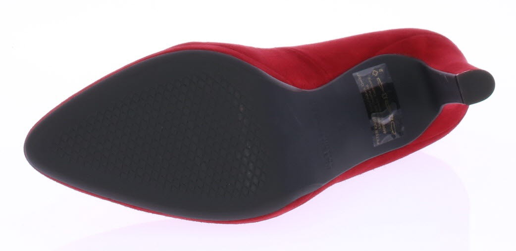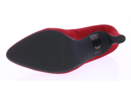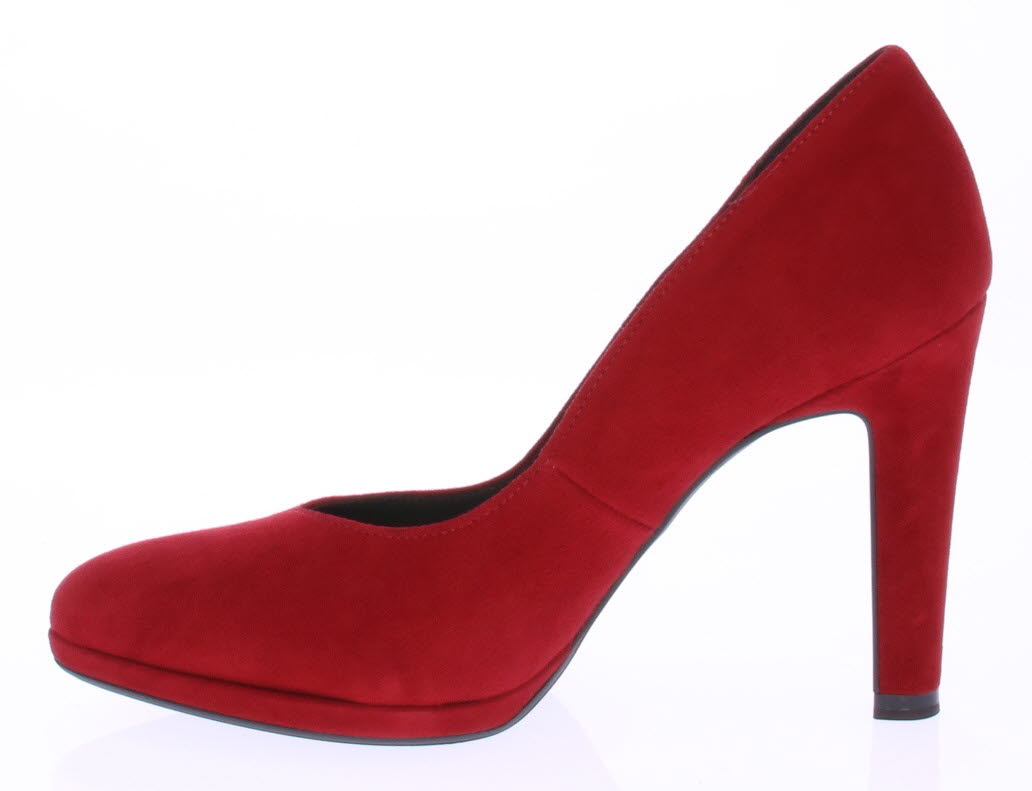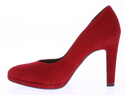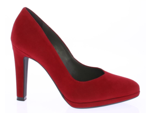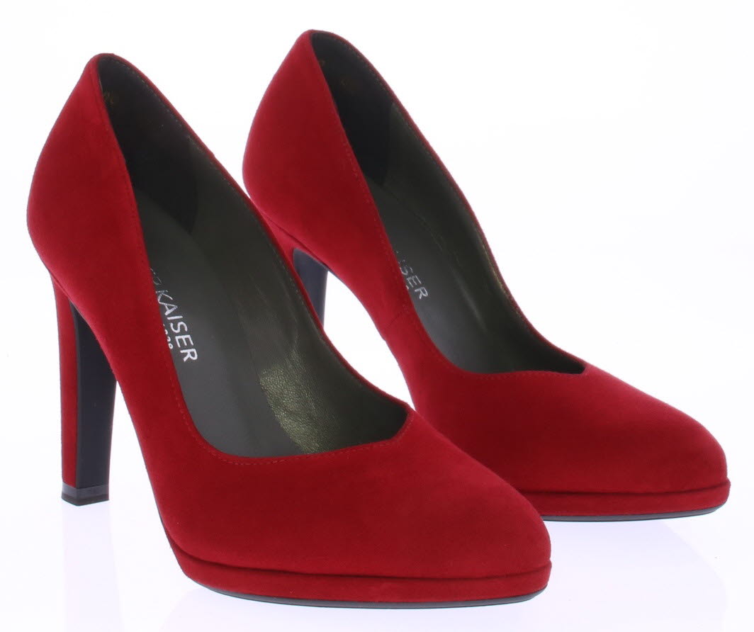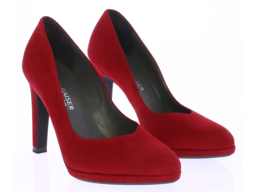 Rood suede dames pump van Peter Kaiser. De pump heeft een 9 centimeter hoge hak maar door het plateau loopt deze zeer comfortabel. Hij heeft een mooie vrouwelijke V-uitsnijding op de voorvoet.