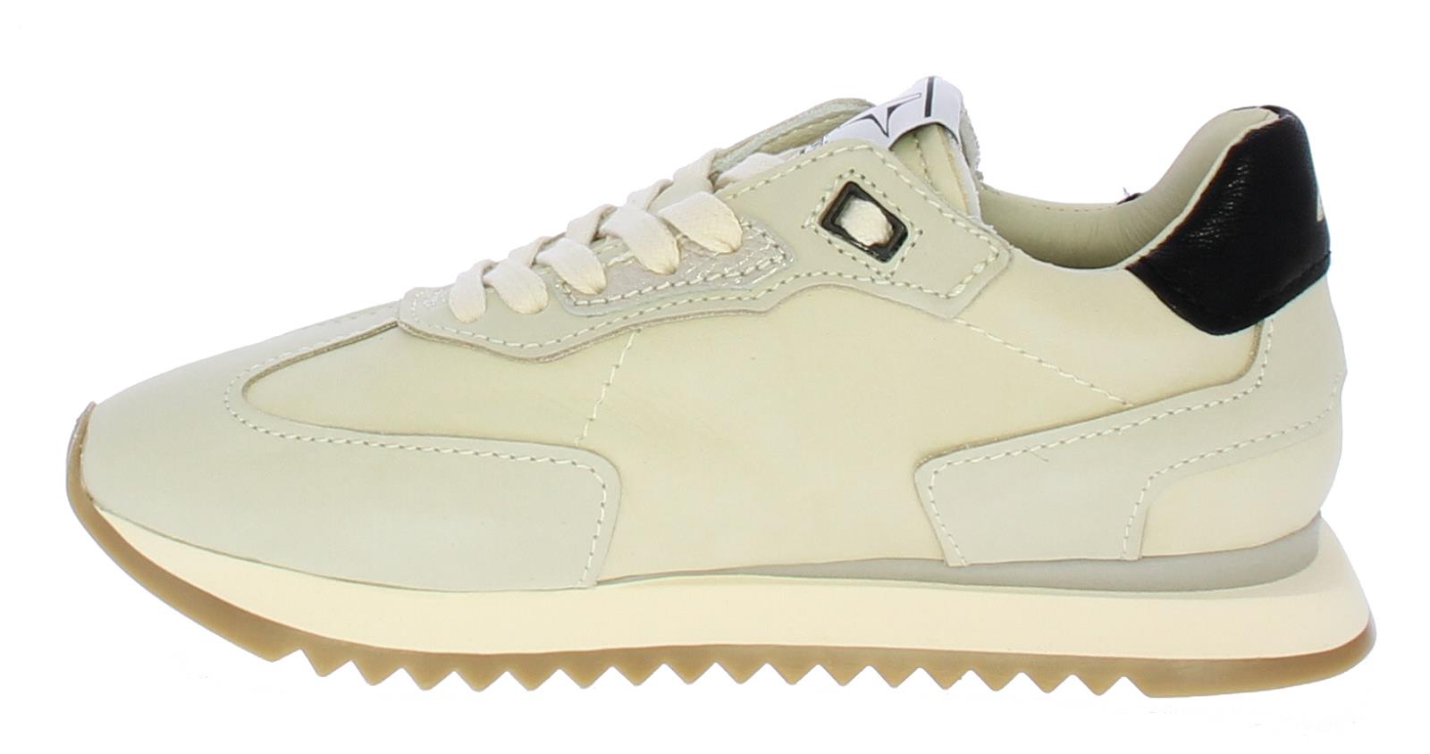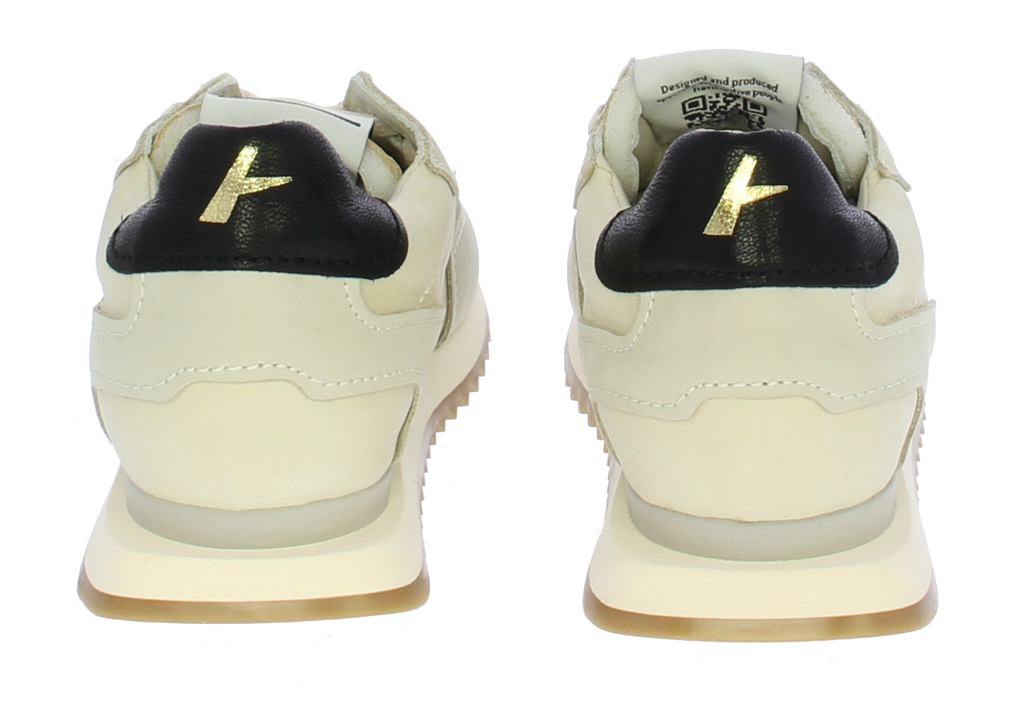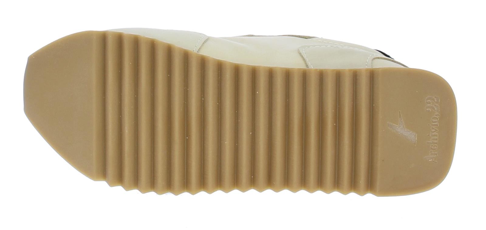 Dames sneaker van Archivio 22 in een room nubuck combi met goud zwart accenten. De schoen heeft een leren voering en een uitneembaar voetbed van kurk. De zool is van rubber.