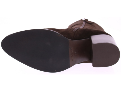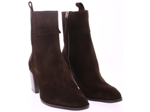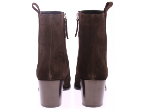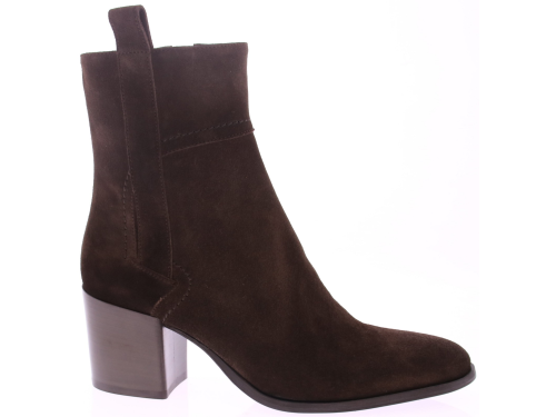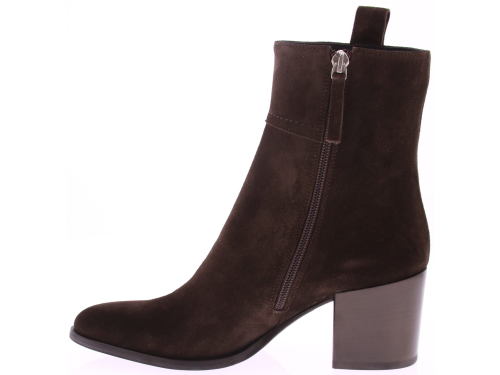 Donkerbruin suede dames enkellaars van Rossano Bisconti, 595-35. Dit laarsje heeft een casual/dressed look door de ovale leest en blokhak van 6 cm. En is voorzien van een rits en heeft aan de zijkant een sierlus. De zool bestaat uit een combinatie van leer met rubber.