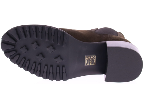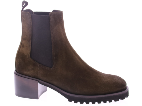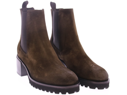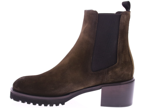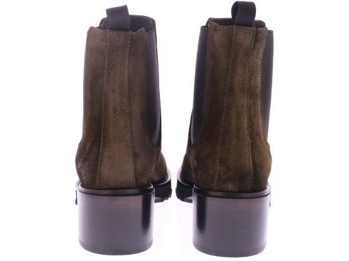 Khaki suede dames enkellaars van Rossano Bisconti, 676-01. Deze sportieve Chelseaboot is uitgevoerd in gevet suede wat hem een stoere look geeft. En is voorzien van een lichtgewicht rubberen profielzool met blokhak van 4 cm. En de voering is van leer.