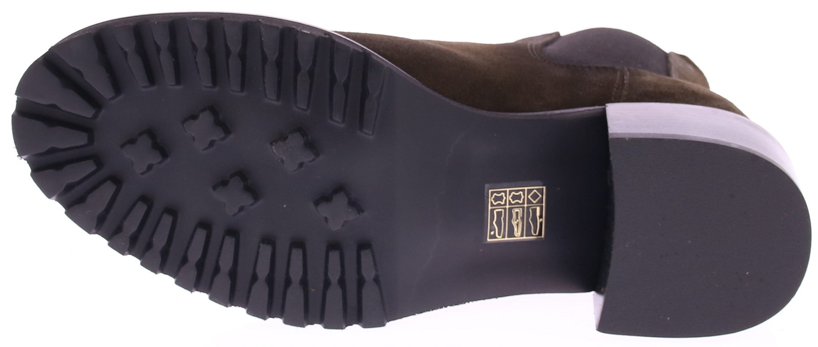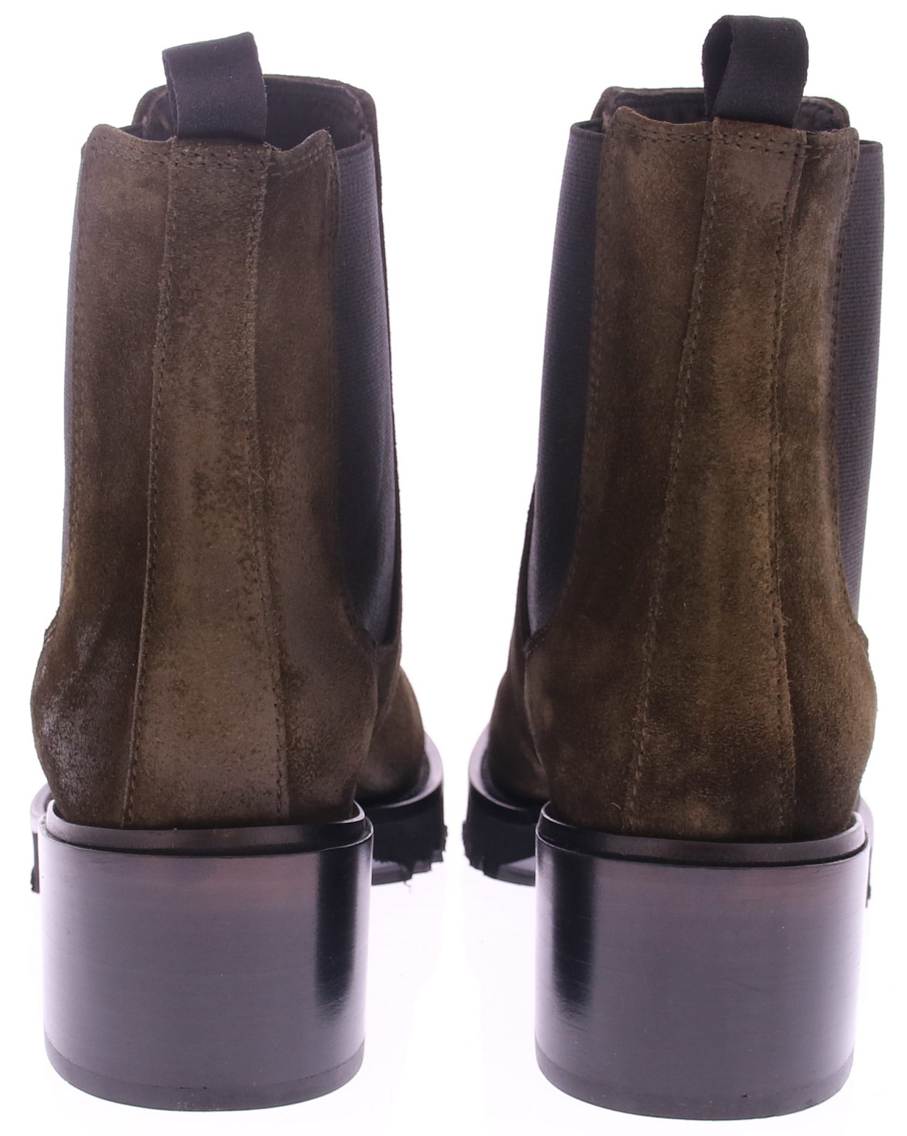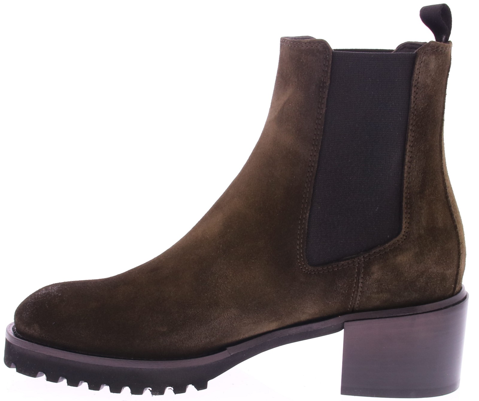 Khaki suede dames enkellaars van Rossano Bisconti, 676-01. Deze sportieve Chelseaboot is uitgevoerd in gevet suede wat hem een stoere look geeft. En is voorzien van een lichtgewicht rubberen profielzool met blokhak van 4 cm. En de voering is van leer.
