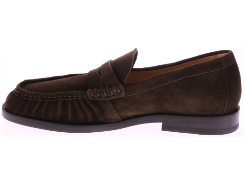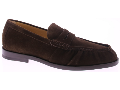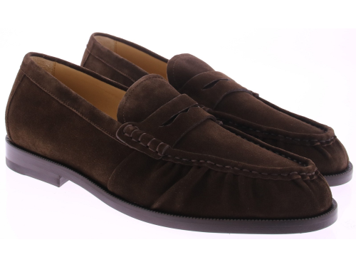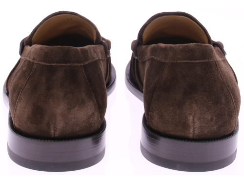 Donkerbruin suède heren mocassin van Rossano Bisconti. Deze elegante instapper is uitgevoerd in soepel suède. De subtiele belijning en klassieke pennyband zorgen voor een stijlvolle afwerking. De leren voering draagt comfortabel en de slanke zool maakt de schoen geschikt voor zowel zakelijke als smart-casual combinaties. Een tijdloze keuze voor de moderne man.