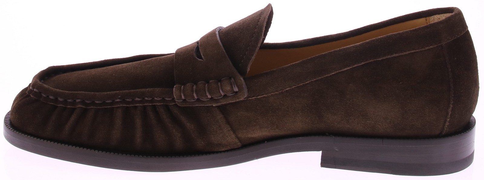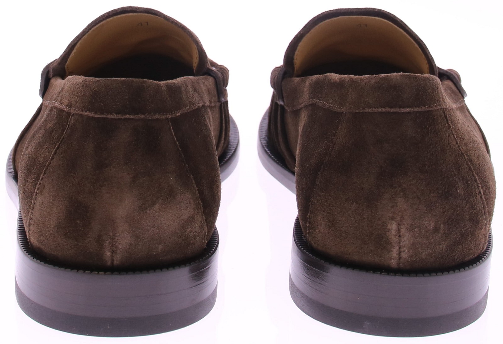 Donkerbruin suède heren mocassin van Rossano Bisconti. Deze elegante instapper is uitgevoerd in soepel suède. De subtiele belijning en klassieke pennyband zorgen voor een stijlvolle afwerking. De leren voering draagt comfortabel en de slanke zool maakt de schoen geschikt voor zowel zakelijke als smart-casual combinaties. Een tijdloze keuze voor de moderne man.