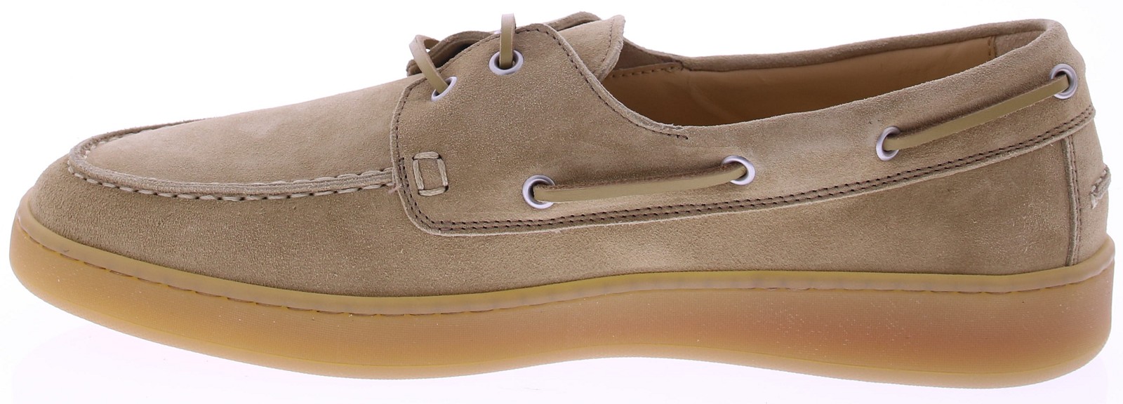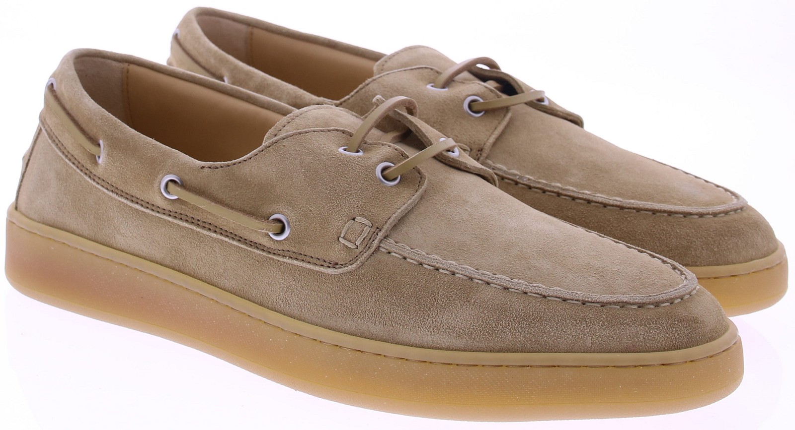 Beige suède heren bootschoenen van Rossano Bisconti. Deze bootschoen is uitgevoerd in suède en volledig leer gevoerd. Het klassieke veterdetail rondom en de subtiele stiksels geven het model een tijdloze, nautische uitstraling. De lichte, flexibele rubberzool zorgt voor een soepele afwikkeling en een moderne touch. Perfect te combineren met een chino of zomers pak voor een stijlvolle, ontspannen look.