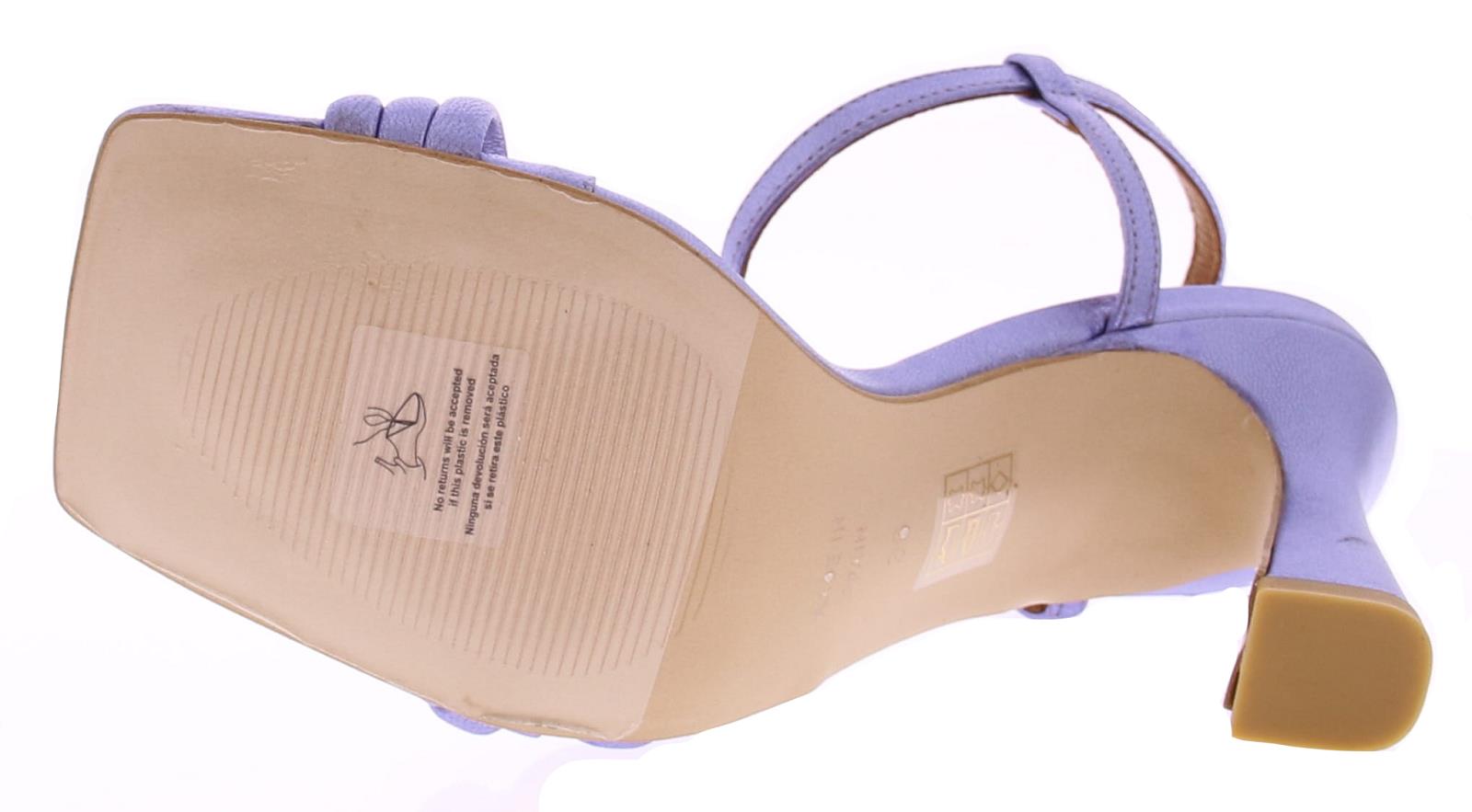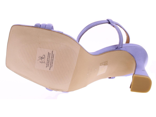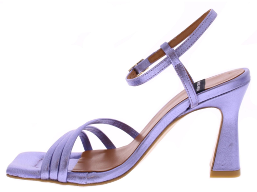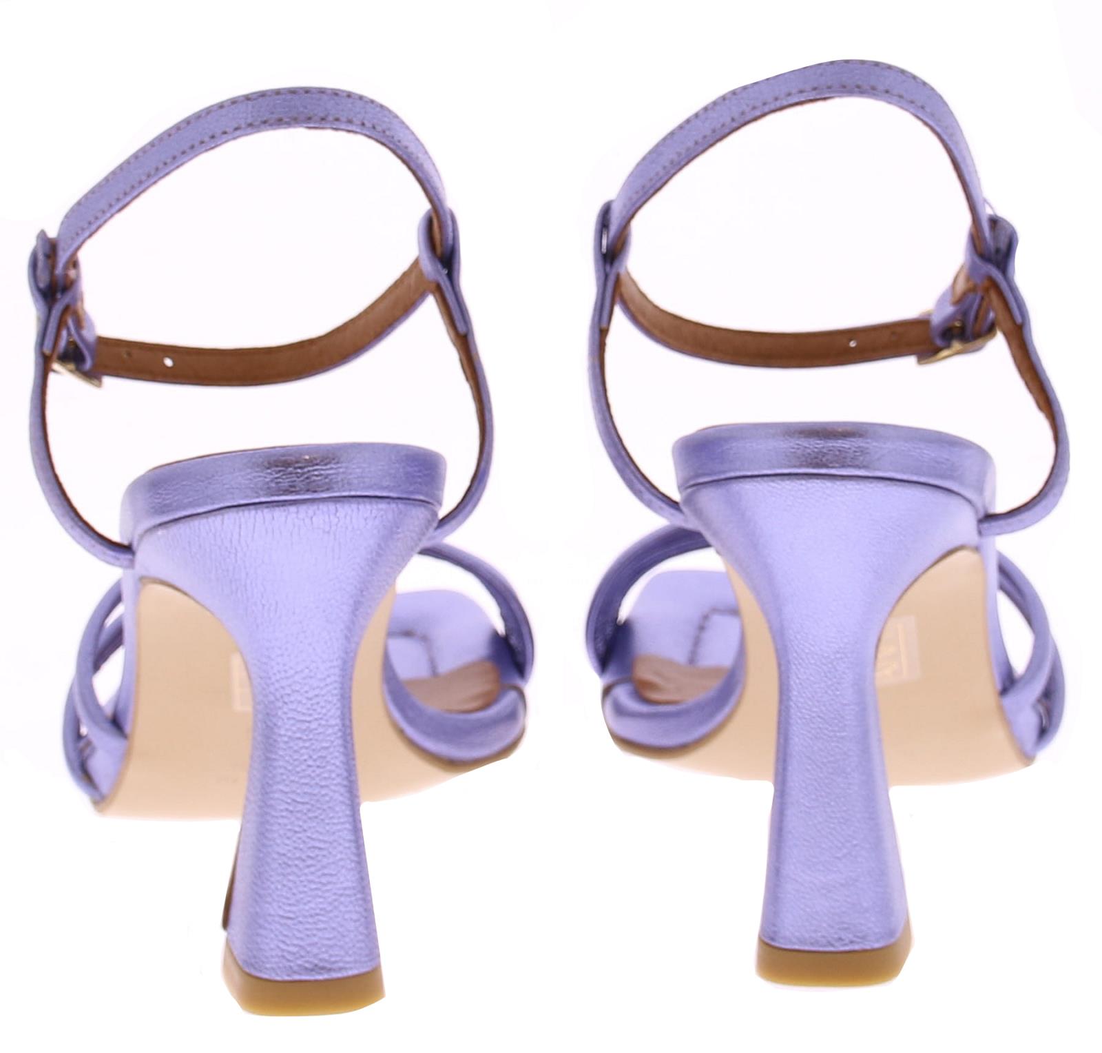 Lila metallic leren dames sandaal van Angel Alarcon. Deze elegante sandaal heeft drie zachte schuine banden over de wreef. De sandaal heeft een vierkanten neus. Met het zachte voetbed komt u gerust de dag door. De hak is iets uitlopend en heeft een hoogte van 8 cm. Het enkelbandje is verstelbaar met een gouden gesp.