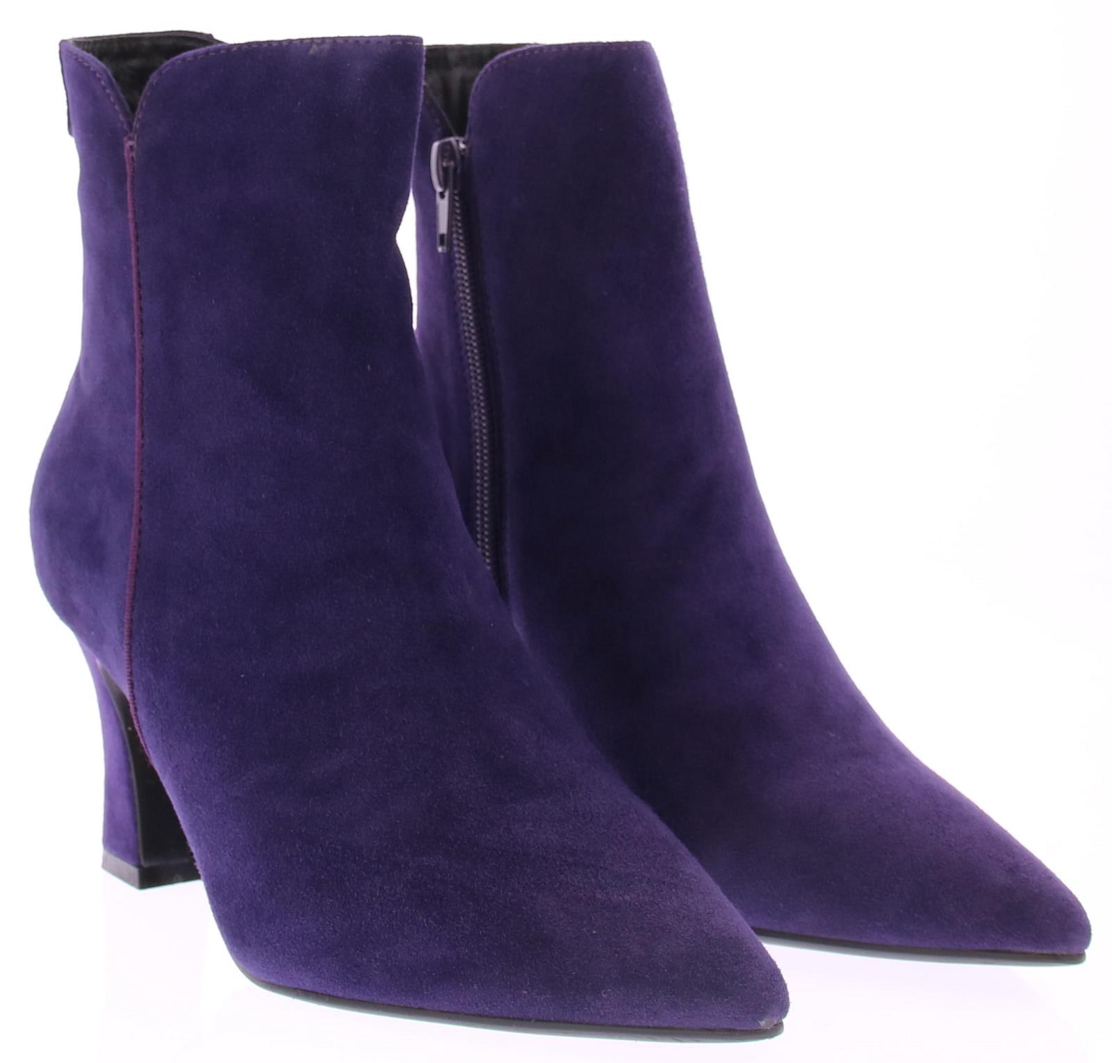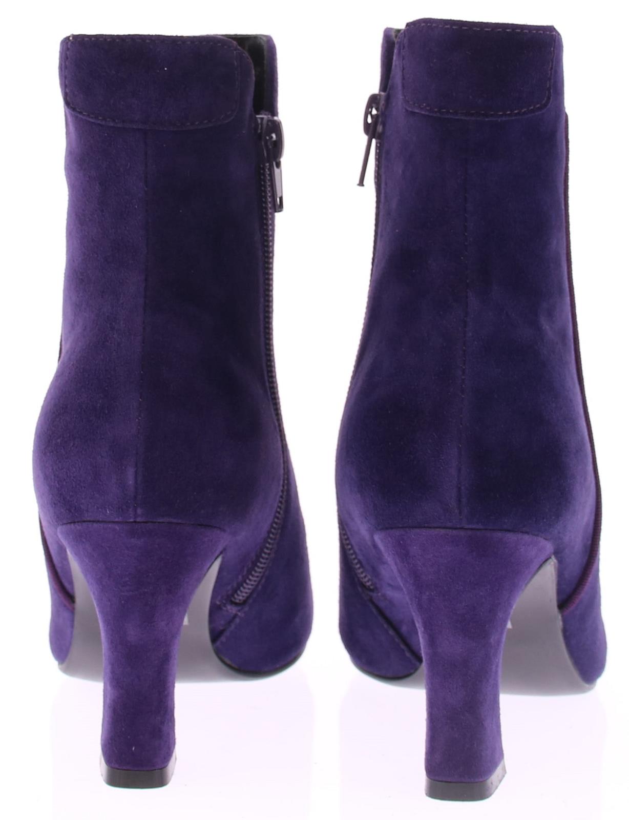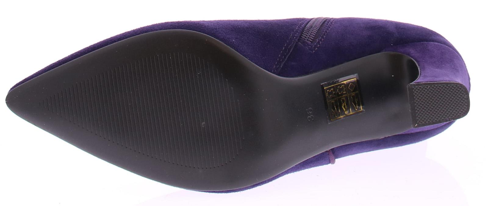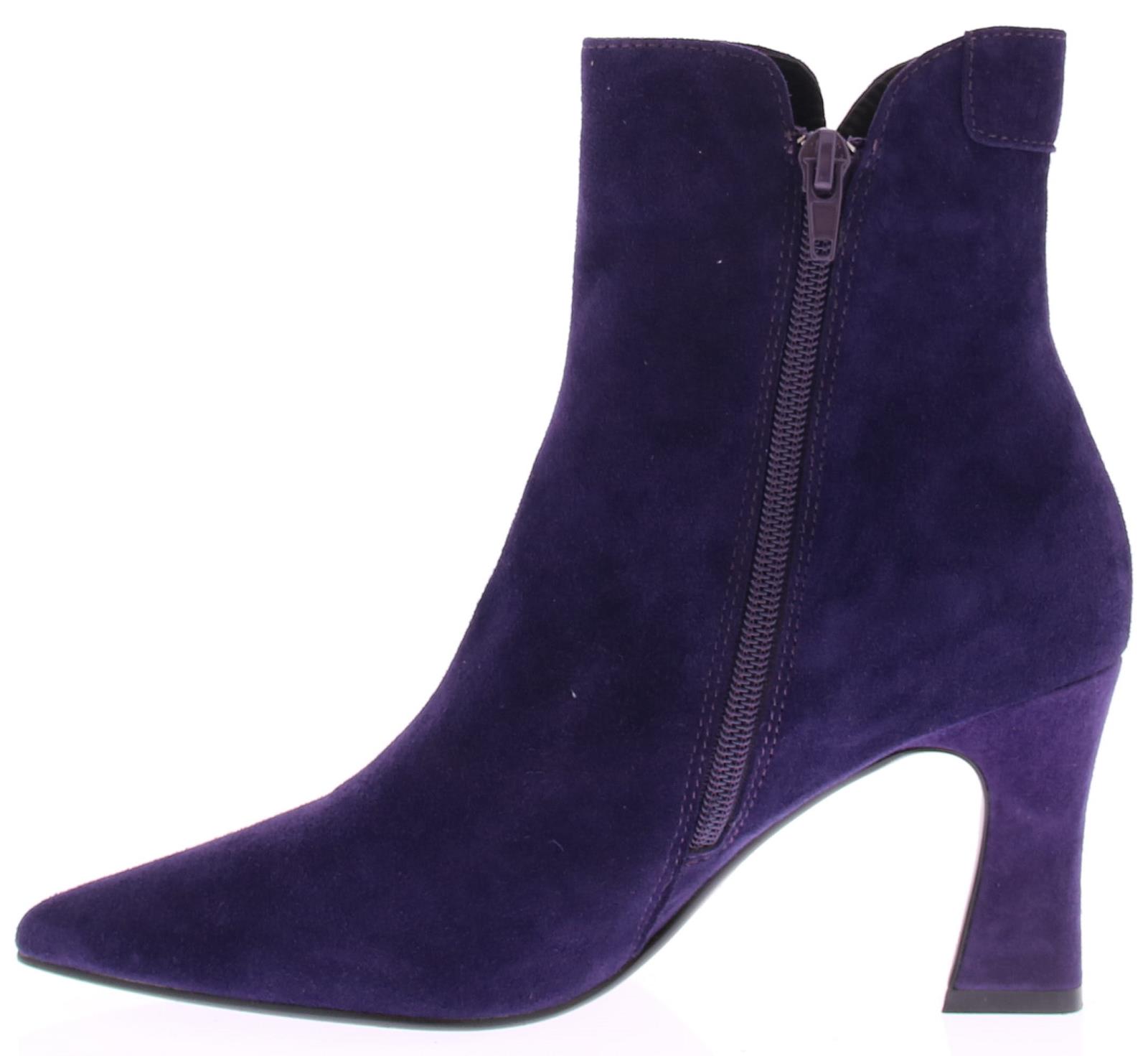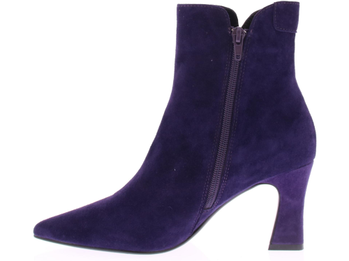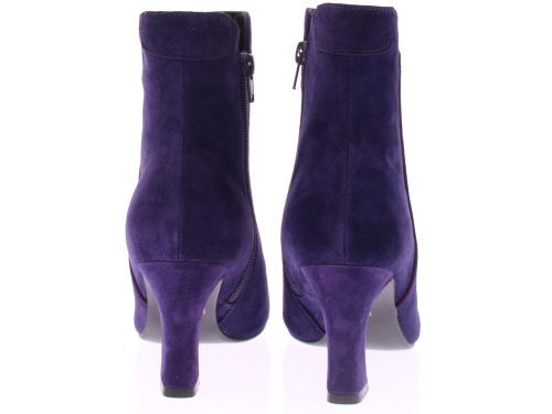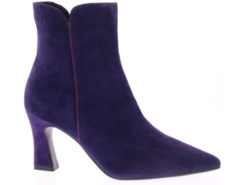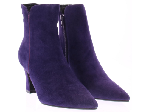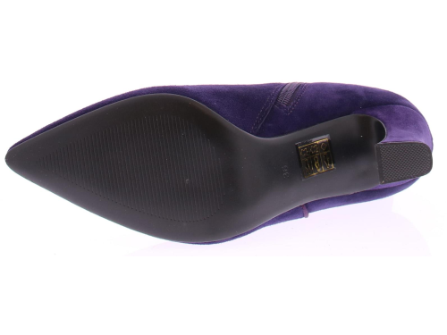Paars suede dames enkellaars van Di Lauro. Deze laars heeft een spitse neus, is leergevoerd, heeft een vast voetbed, een rubberen zool, en een iets uitlopende hak van 7 cm.