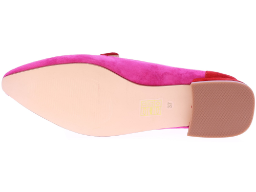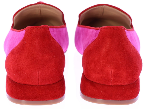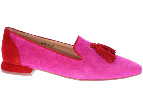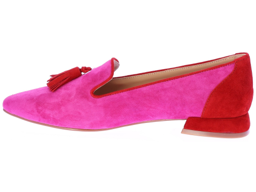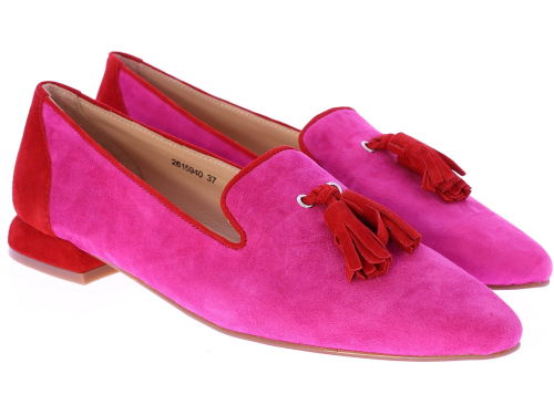 Fuchsia met rood suède dames instappers van Di Lauro, model Diodata. Deze instapper heeft een spitse neus en is afgewerkt met speelse suède kwastjes op de voorvoet. De combinatie van twee tinten geeft het model een frisse en moderne uitstraling. De voering is van leer. De hak is 2 cm hoog. Een stijlvol model dat moeiteloos te combineren is met zowel pantalon als jeans.