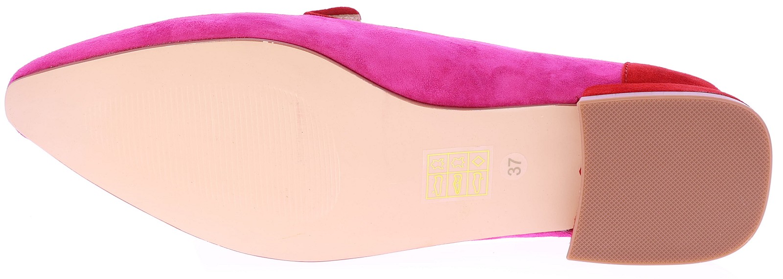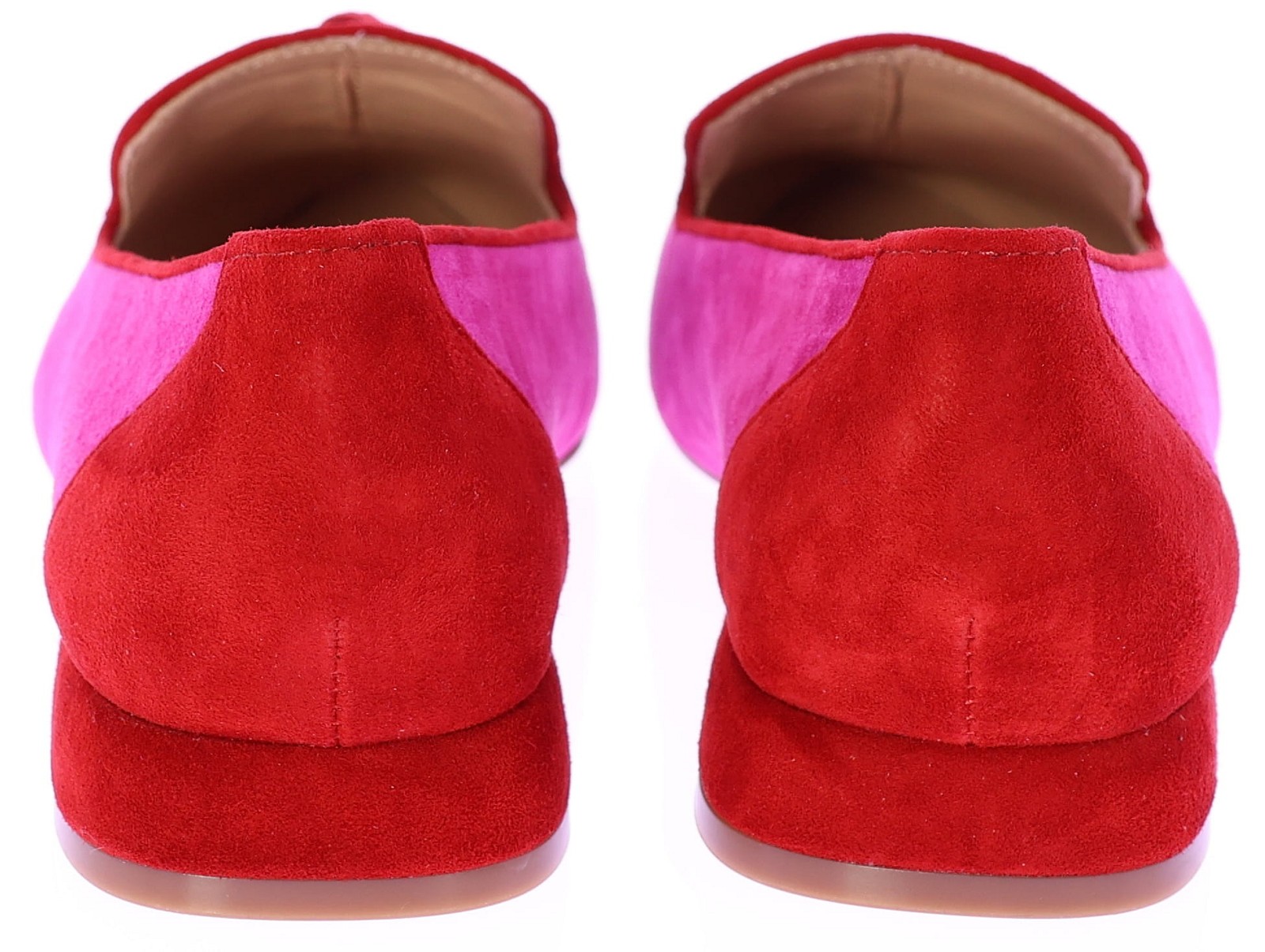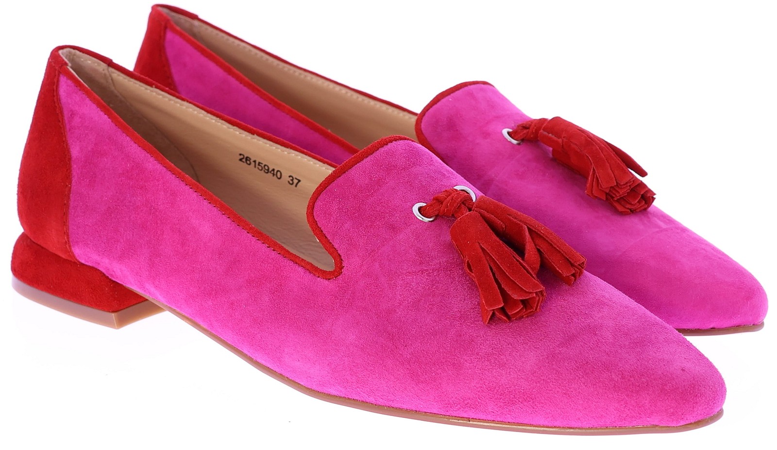 Fuchsia met rood suède dames instappers van Di Lauro, model Diodata. Deze instapper heeft een spitse neus en is afgewerkt met speelse suède kwastjes op de voorvoet. De combinatie van twee tinten geeft het model een frisse en moderne uitstraling. De voering is van leer. De hak is 2 cm hoog. Een stijlvol model dat moeiteloos te combineren is met zowel pantalon als jeans.