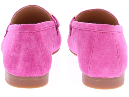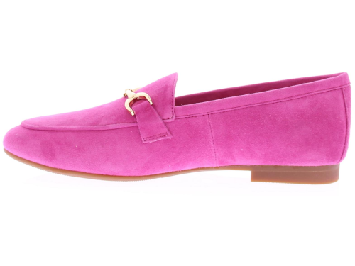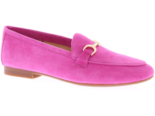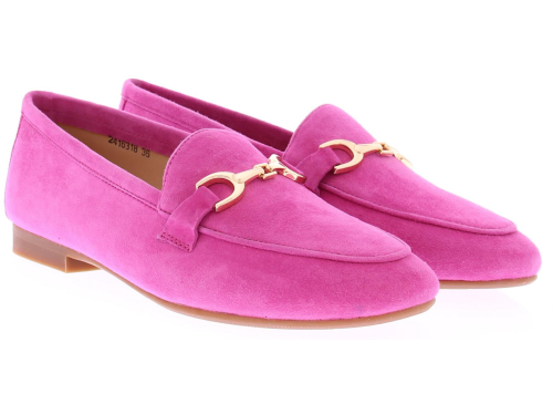 Fuchsia suede dames instapper van Di Lauro. Deze instapper met een ovale leest heeft op de wreef een fijne goudkleurige bit. Dit model is leergevoerd, met een vast voetbed, en heeft een kunststof zool en een lage hak van 2 centimeter. Met deze mooie loafer geef je ieder outfit een chique uitstraling!
