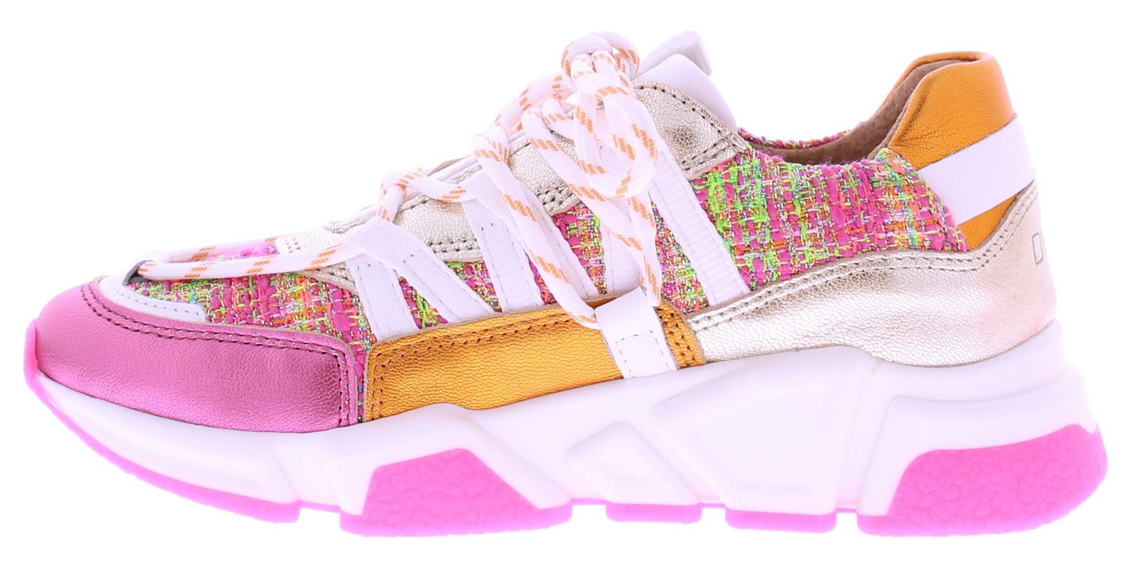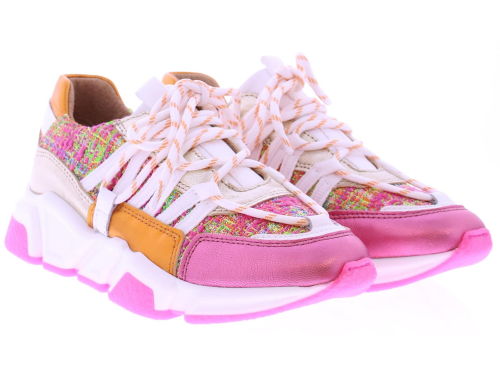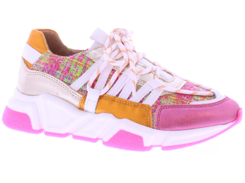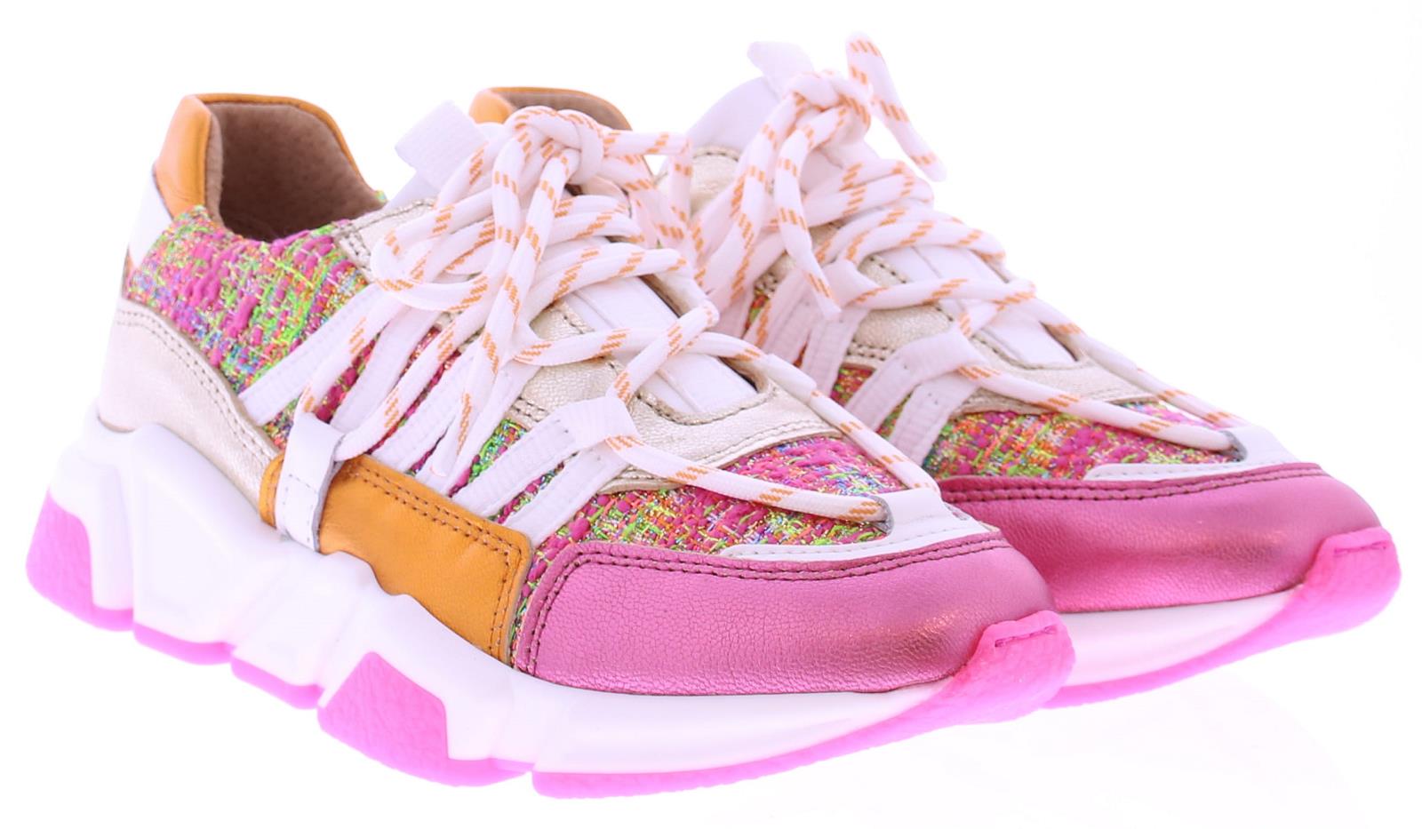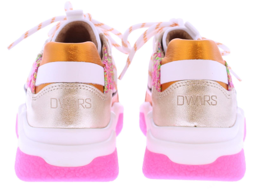Multikleurige dames sneaker van DWRS. Model Los Angeles in de kleur roze multi is gemaakt in een combinatie van leer met stof en suede. Mooie leuke zomerse combinatie van roze, oranje, fuchsia, wit en klein beetje zilver. En afgewerkt met de kenmerkende veter die over de schoen loopt. De zool is vervangbaar voor u eigen persoonlijke inlegzool. Dit model valt klein bij twijfel adviseren wij u een maat groter te bestellen.