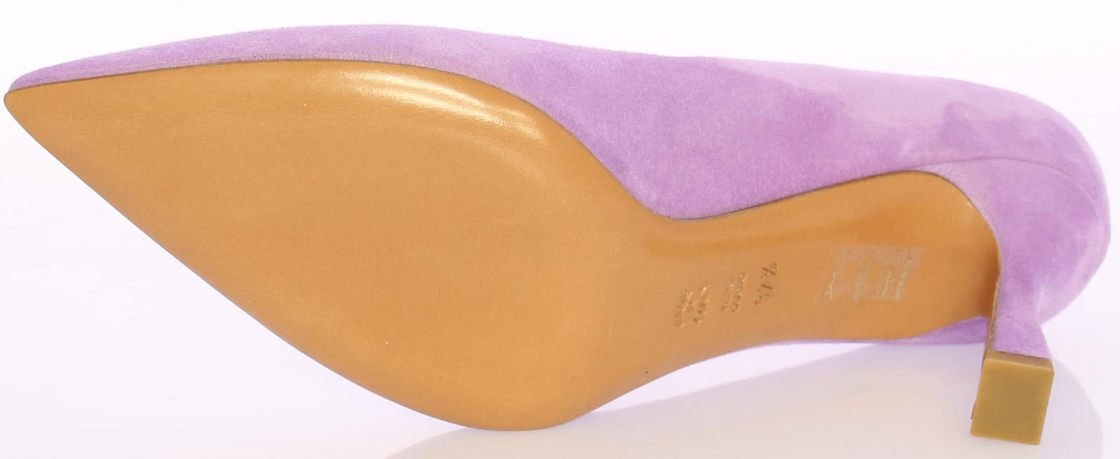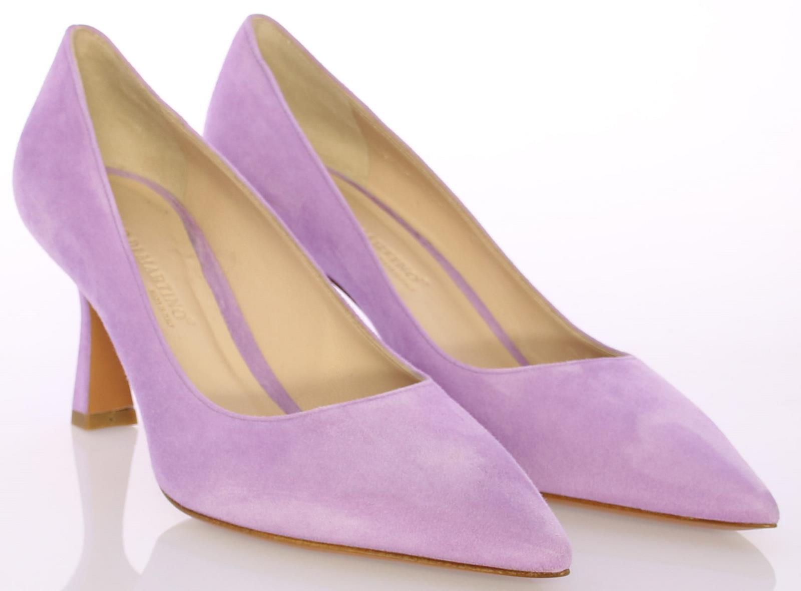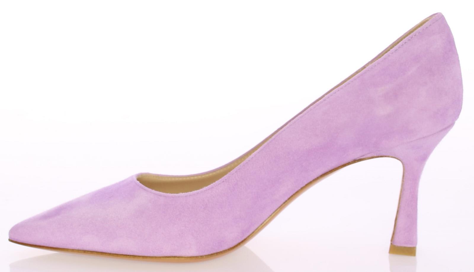 Lila suede dames pump van Enzo di Martino. Deze pump heeft een spitse neus en is leer gevoerd. De iets uitlopende hak heeft een hoogte van 7 cm. De zool is geheel van leer.