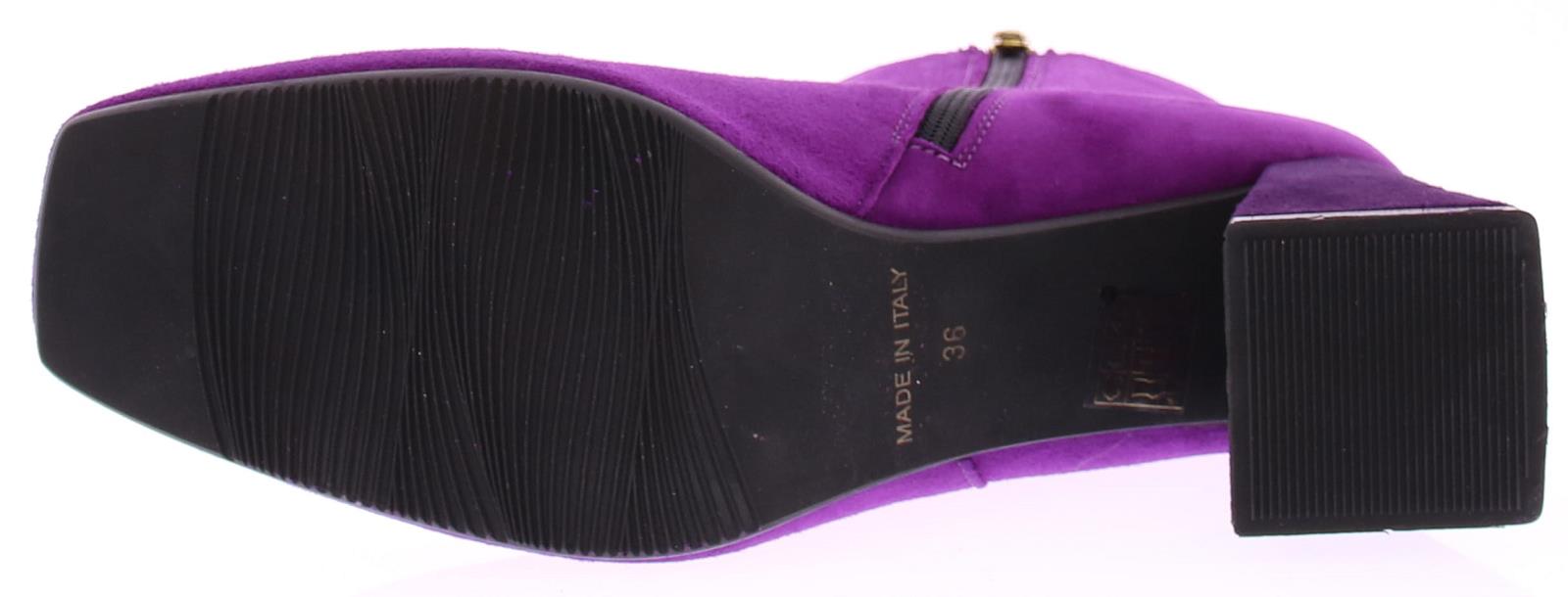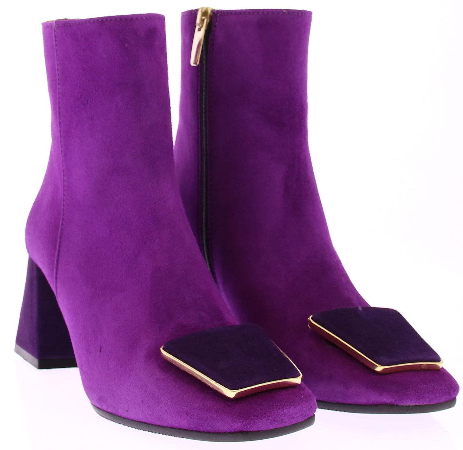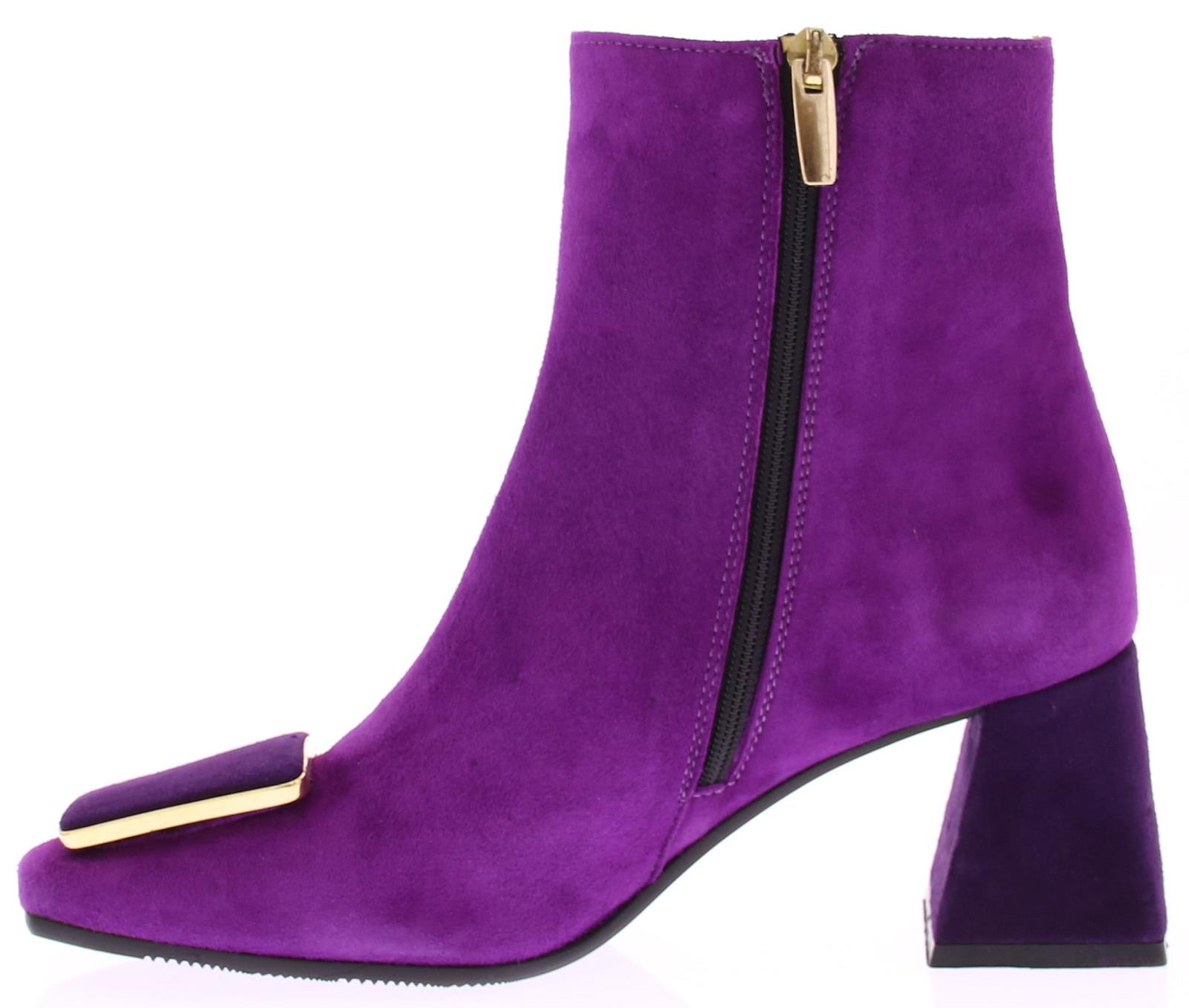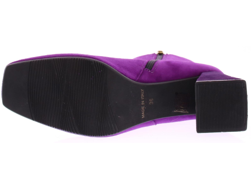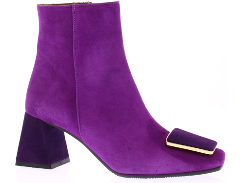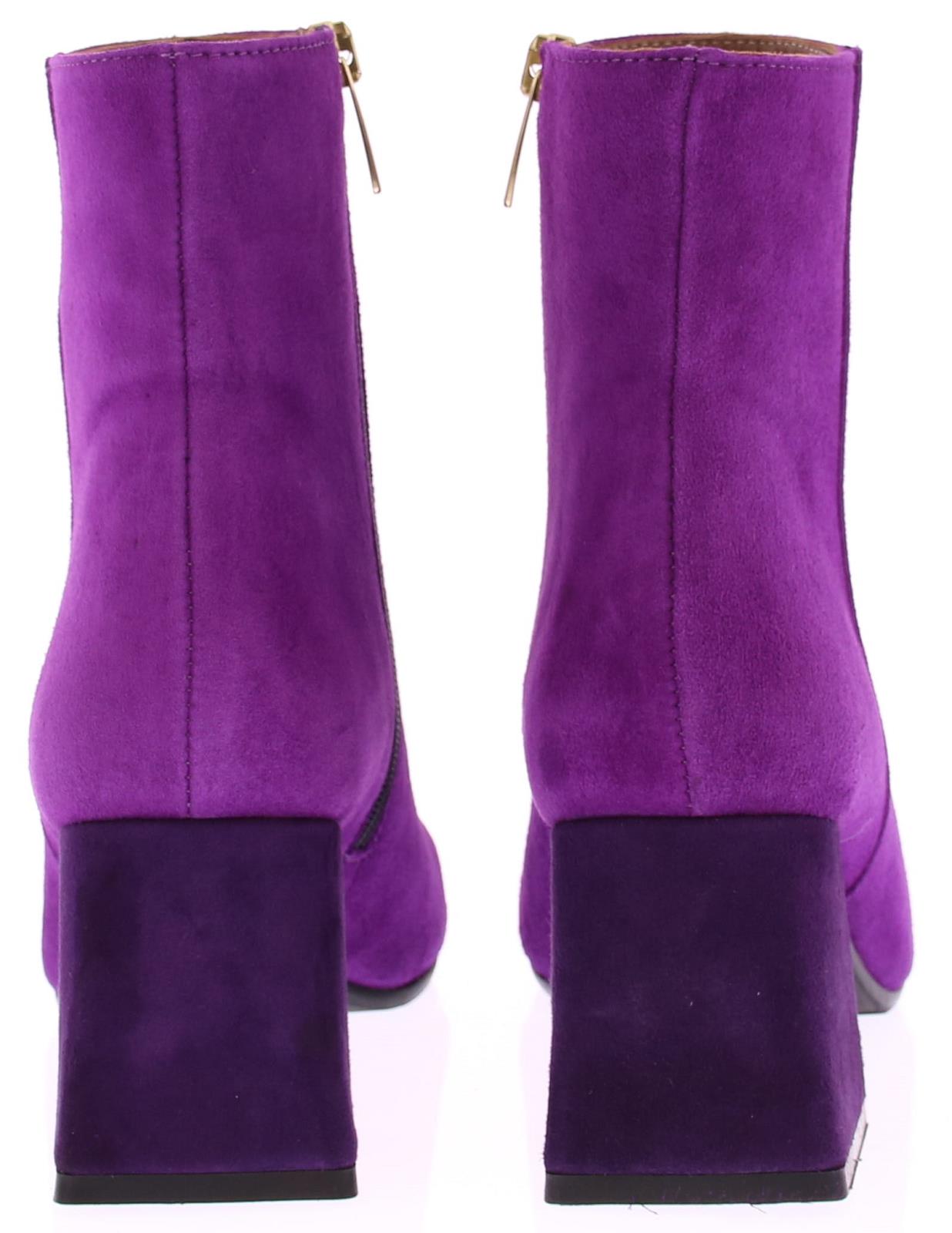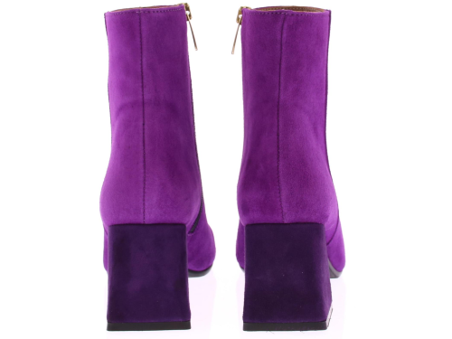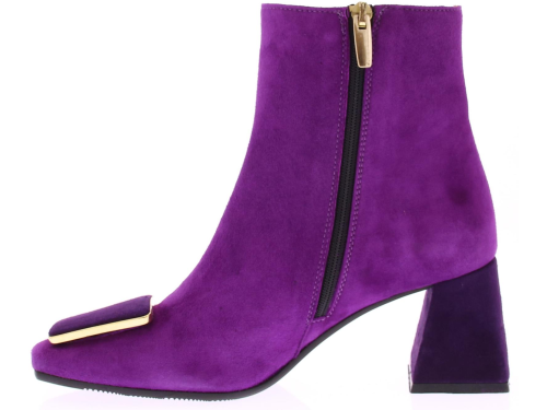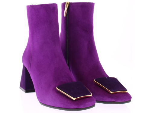 Fuchsia suede dames enkellaars van Evaluna. Deze laars met afgeronde leest heeft een leuke paarse garnering met goudkleurig randje op de voorvoet. De hak is bekleed met paars suede en heeft een comfortabele hoogte van 6 cm.