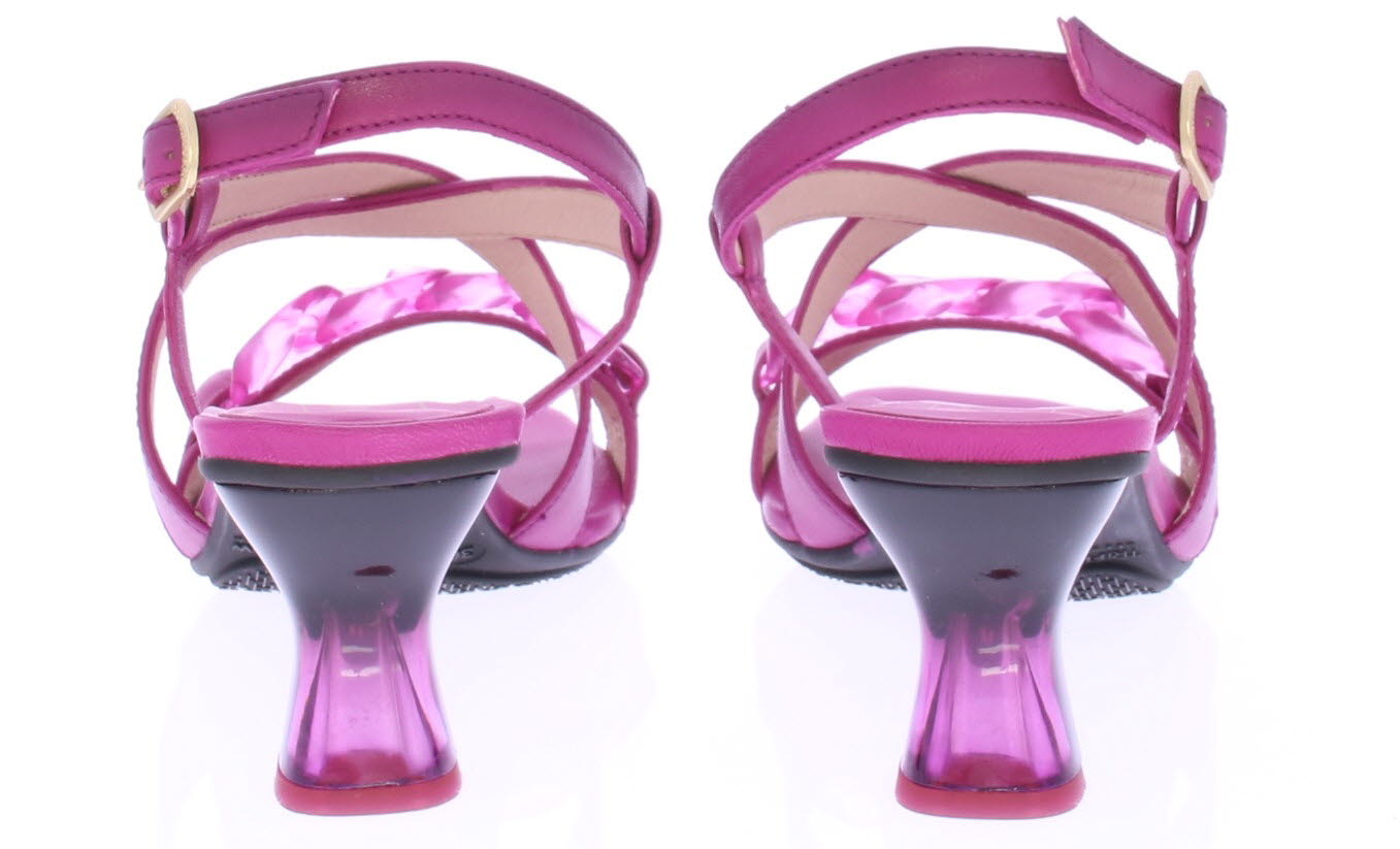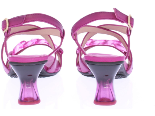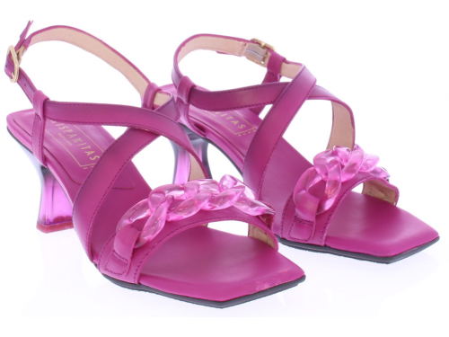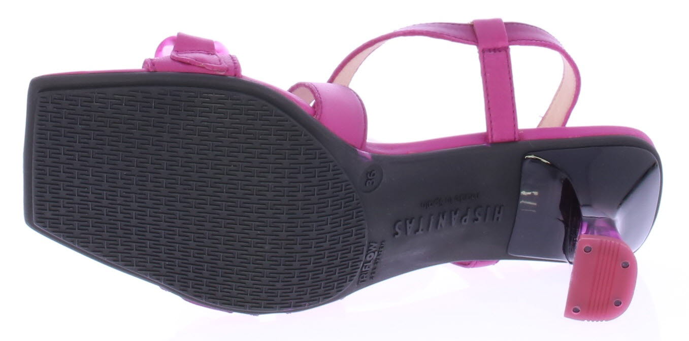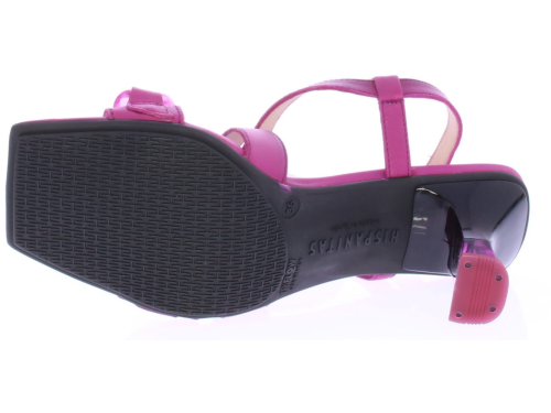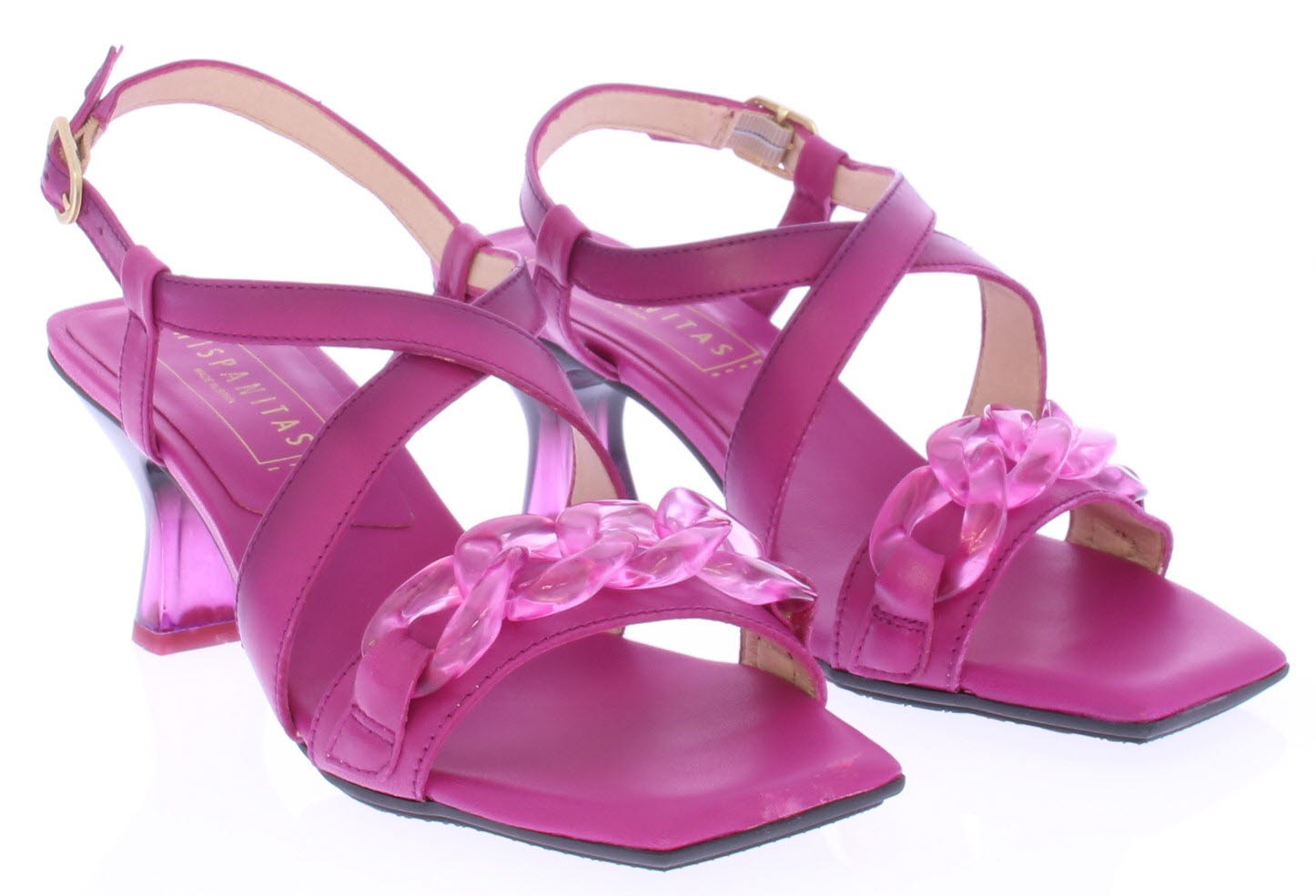 Fuchsia leren dames sandaal van Hispanitas. Met triple padding gelsystem zool voor comfort en een hak van 6 cm. De ketting garnering is gemaakt van kunststof in dezelfde kleur als de hak. Het hielbandje is verstelbaar d.m.v. een gespje.