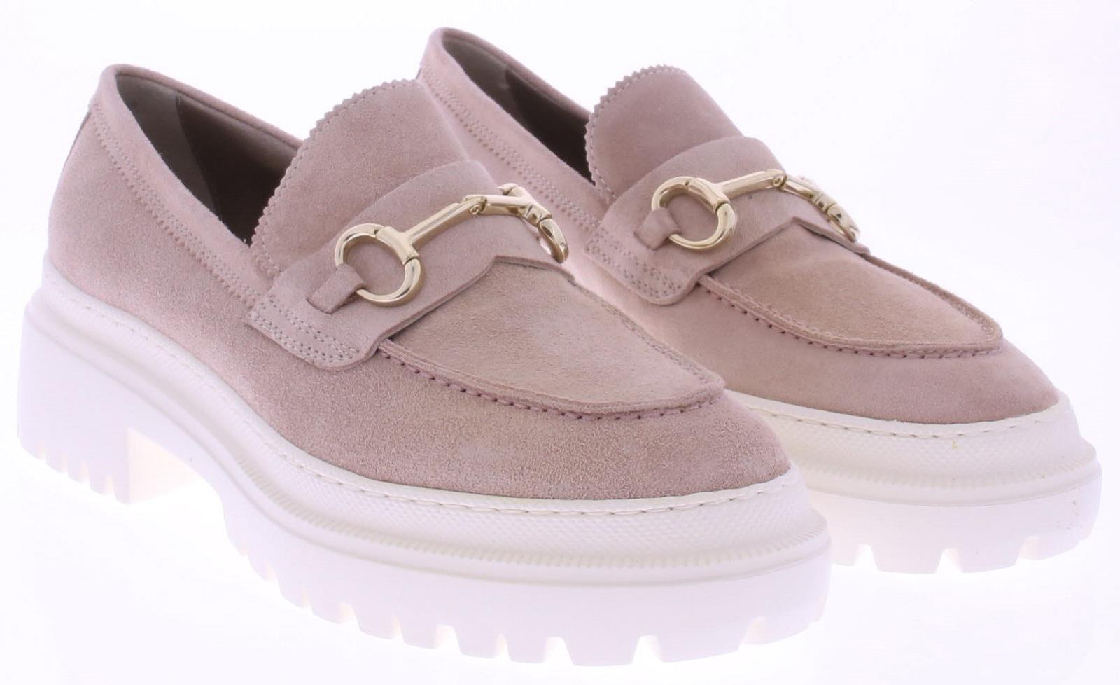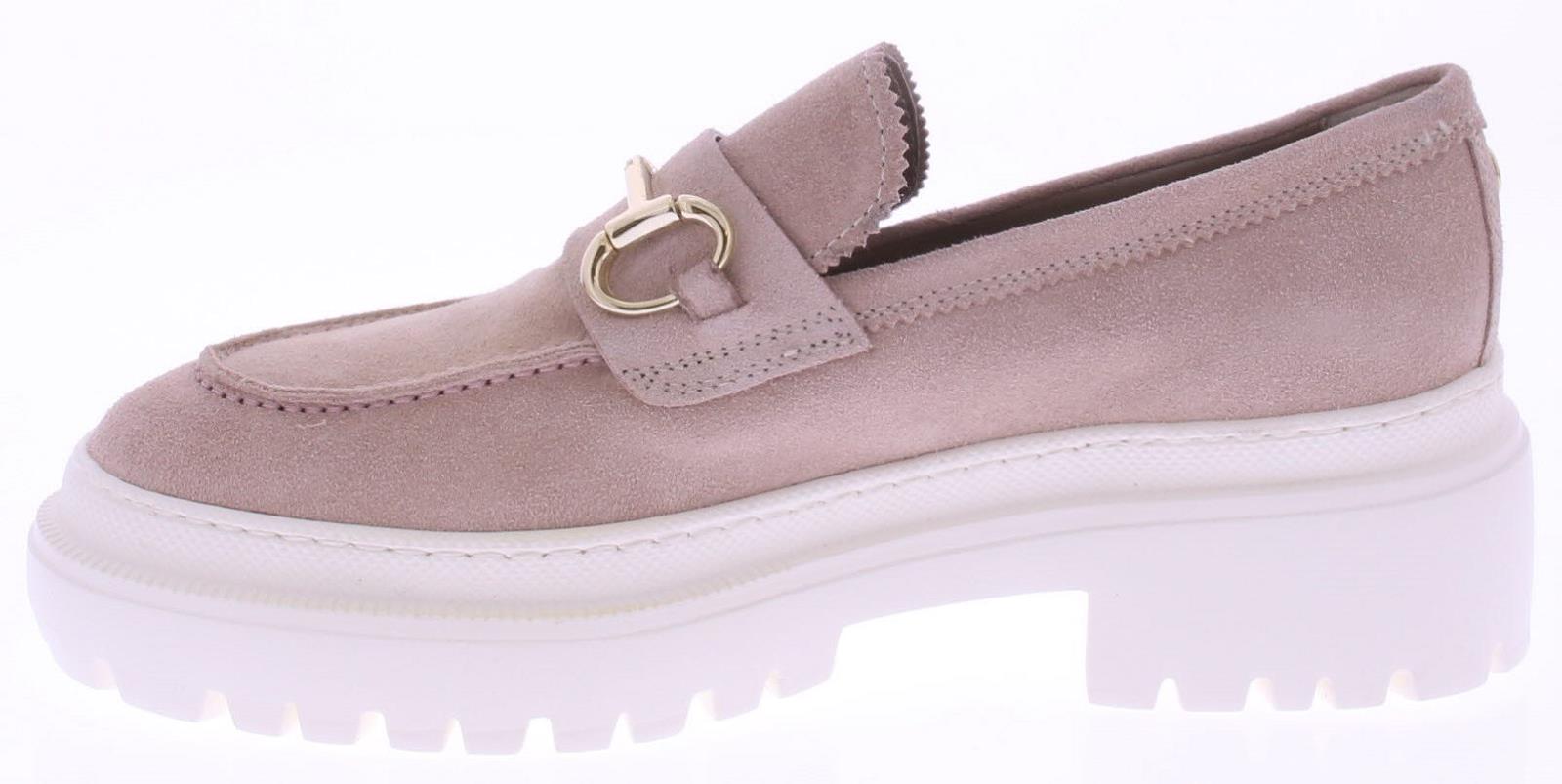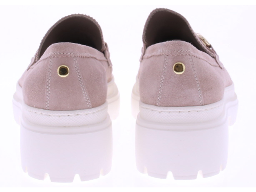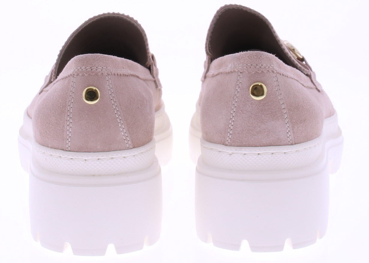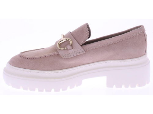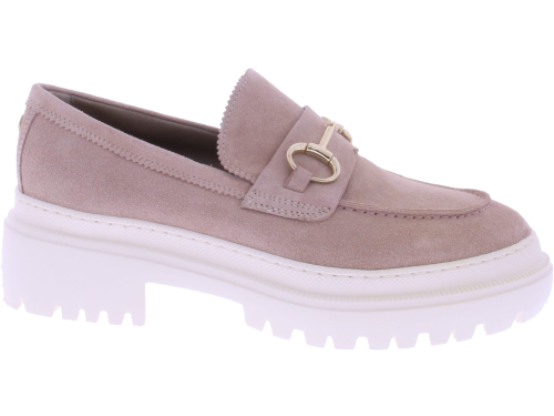 Mauve-kleurige suede dames instapper van La Cabala. Uitgevoerd op een sportieve witte zool met een goudkleurig bit. La Cabala staat bekend om zijn gebruik van zachte luxe leersoorten in combinatie met een goede pasvorm.