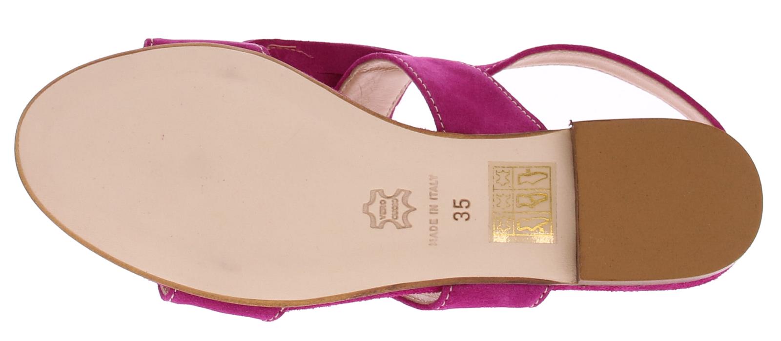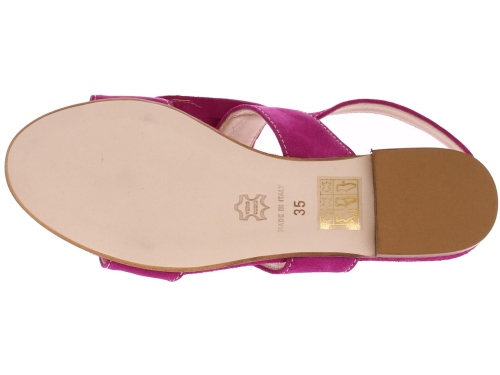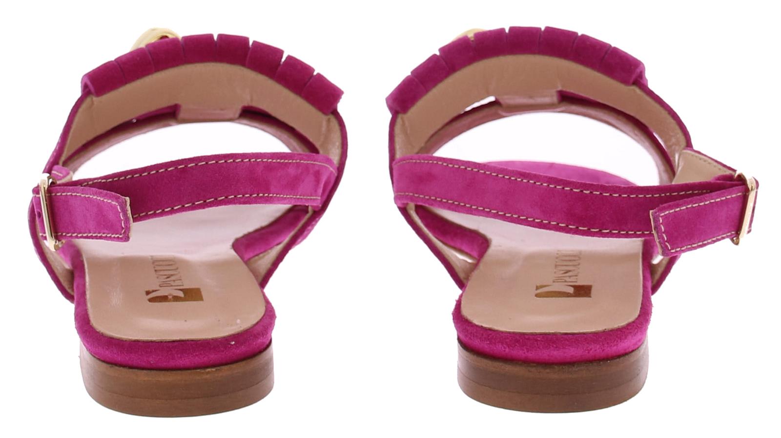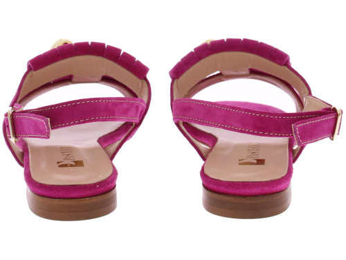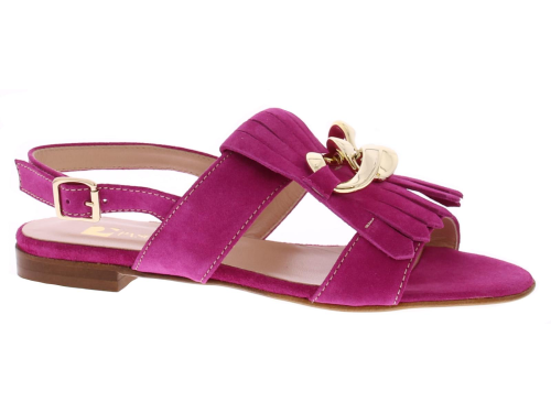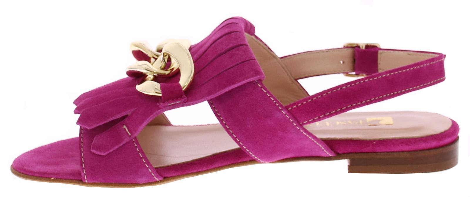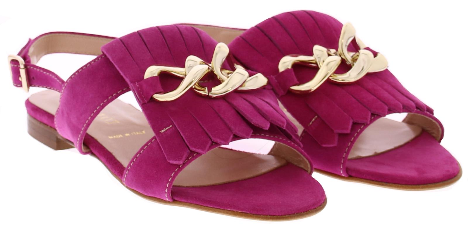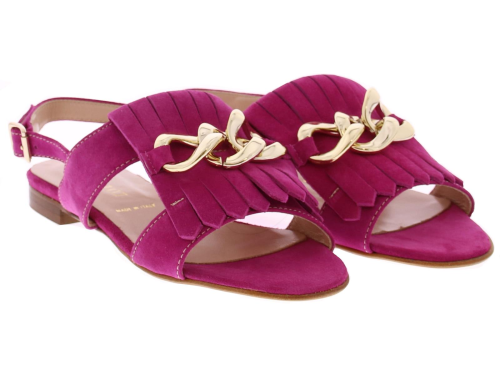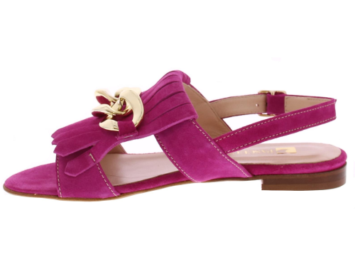 Fuchsiakleurige suede dames sandaal van Pascucci. Helemaal leer gevoerd en afgewerkt met een jamboreeklep op de wreef met daarop een goudkleurige ketting. Het hielbandje is verstelbaar met een goudkleurig gespje en de zool is van leer. De binnenzool is lekker zacht.