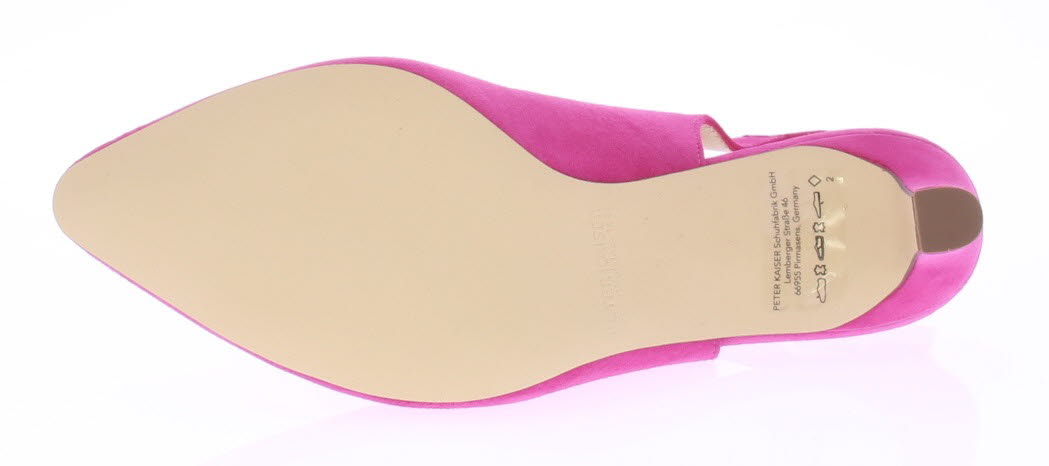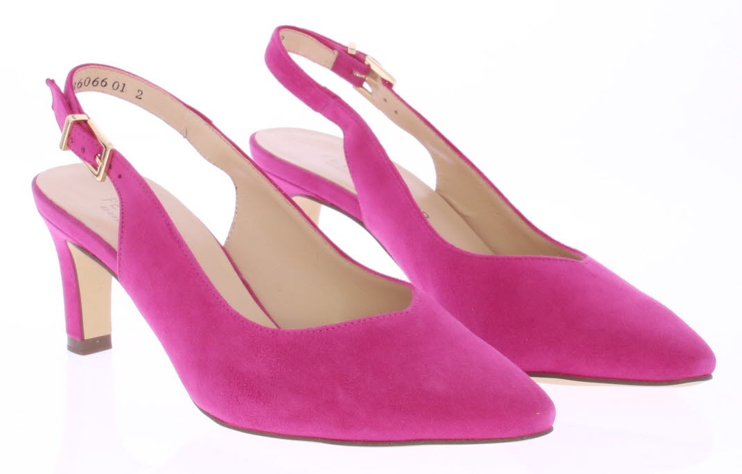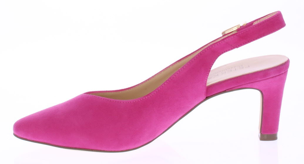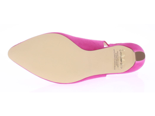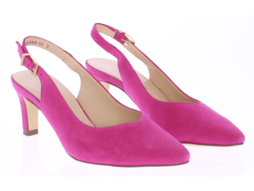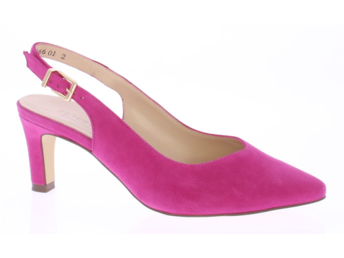 Fuxia suède dames slingback van Peter Kaiser. De schoen heeft een 6 cm hak. Het bandje is verstelbaar met een gespje en de schoen heeft een mooie elegante V-uitsnijding.