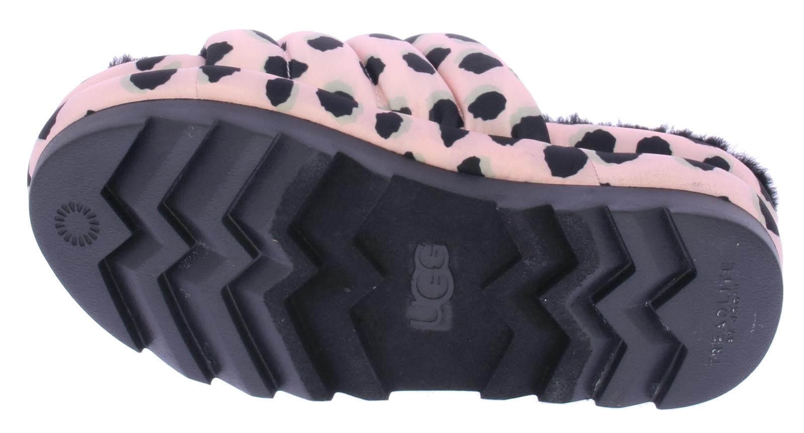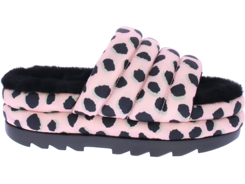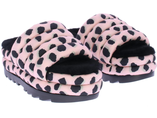 Roze/zwarte dames slipper van Ugg. De Maxi slide sheetah print in pink scallop. Comfortabele slipper met puffy banden over de wreef en langs de zool. Gevoerd met lekkere zachte schapenvacht.