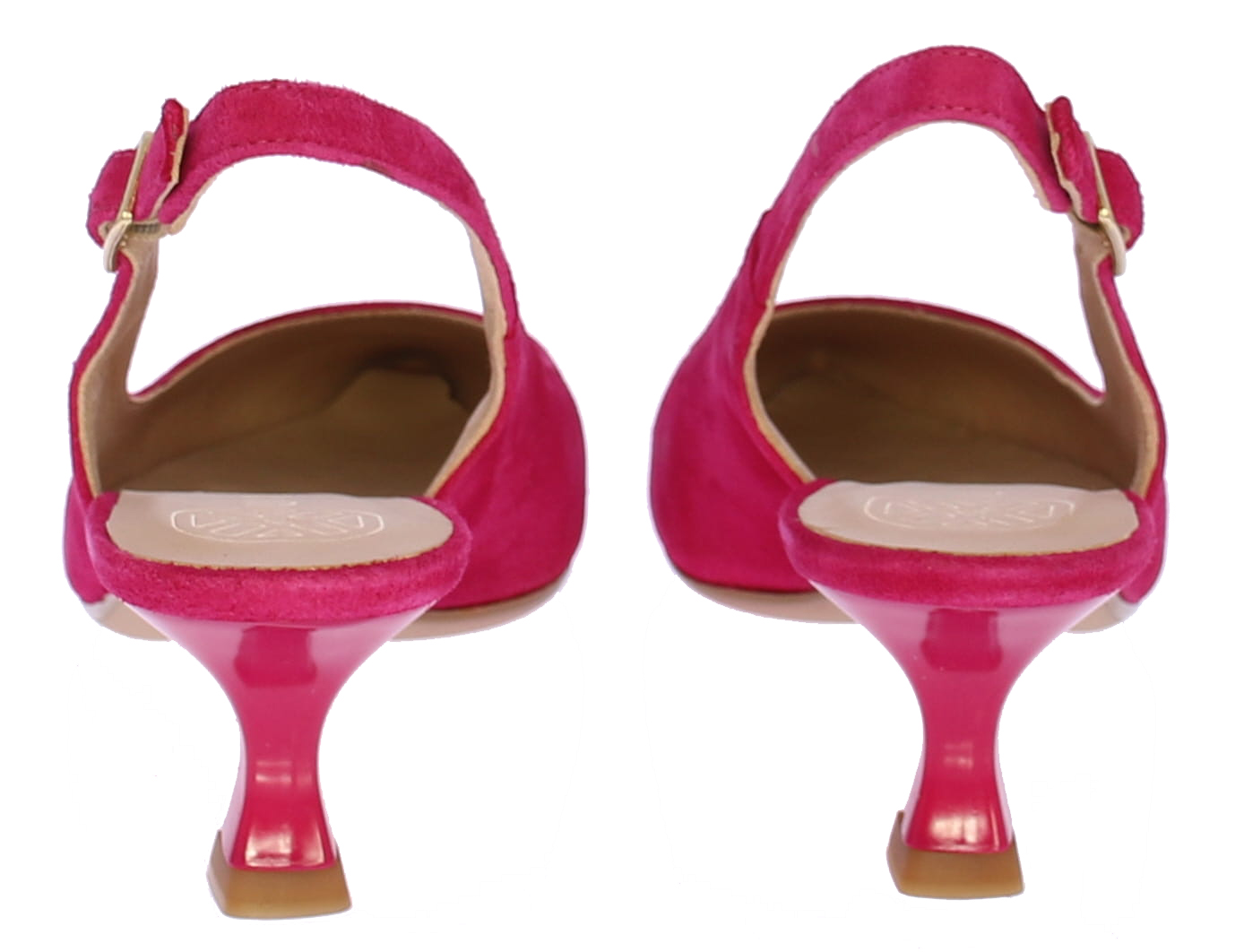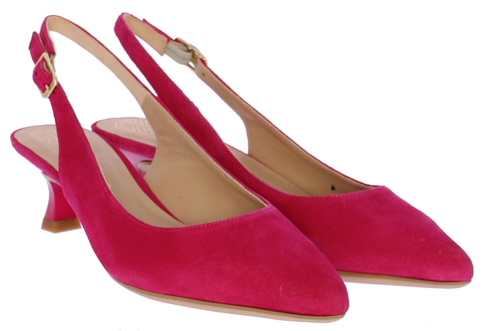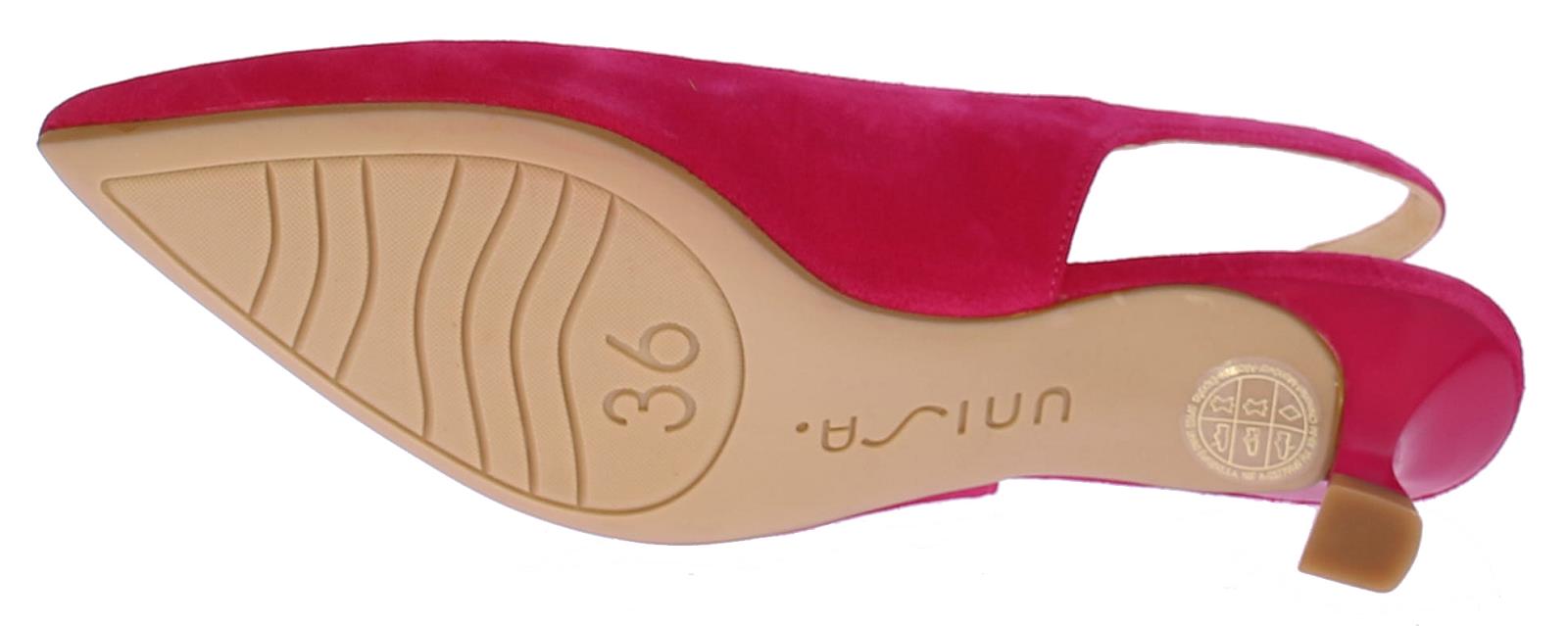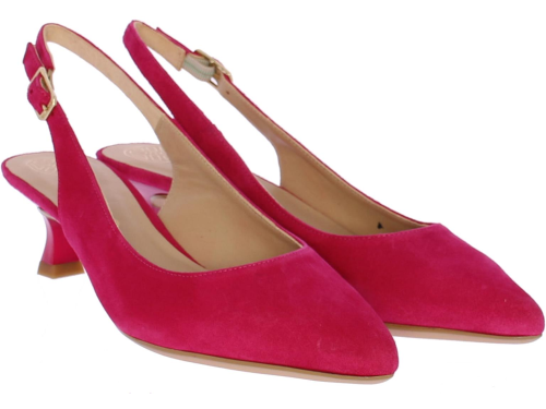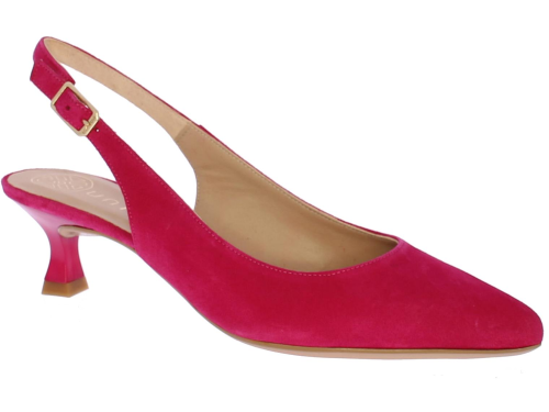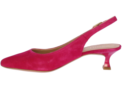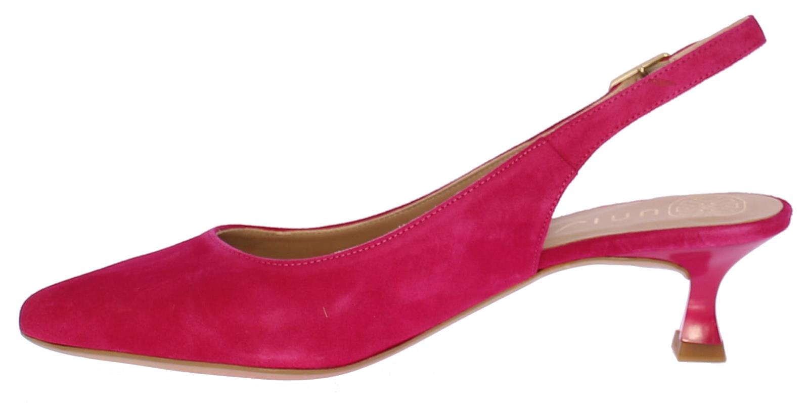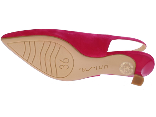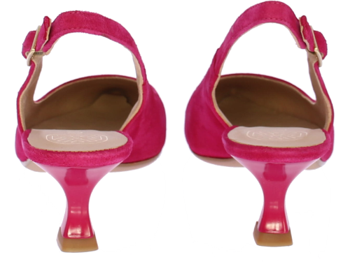 Fuschia suede dames slingback van Unisa. Het bandje rondom de enkel is te verstellen met een goudkleurige gesp. De neus is iets spitser en hij heeft een queenie hakje van 4 cm. Bij deze schoen is een bijpassend tasje verkrijgbaar.