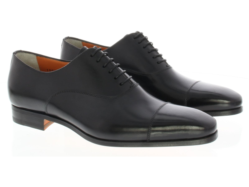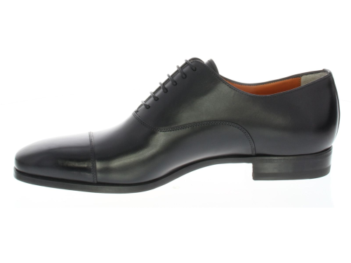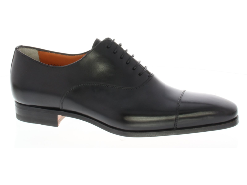 Zwarte leren heren veterschoen van Santoni. De schoen heeft een neusnaad en is uitgevoerd in mooi kalfsleer. De schoen heeft een lederen voering en zool.