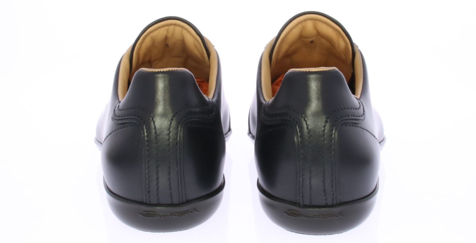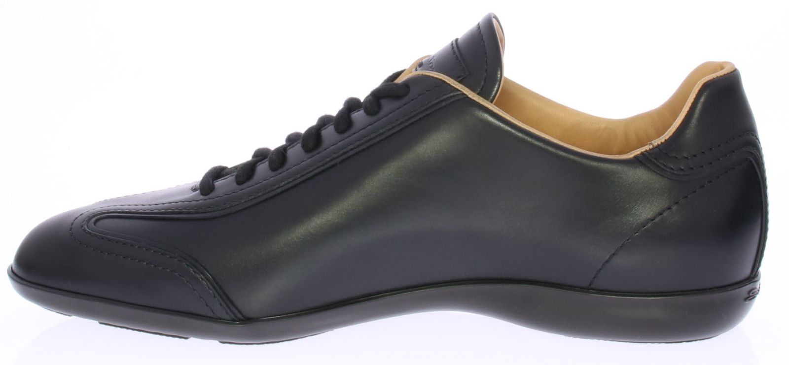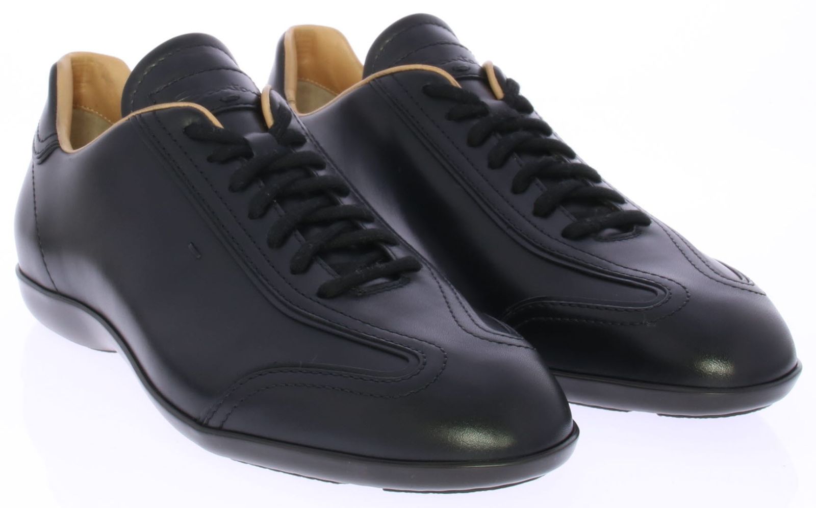 Zwart leren heren sneaker van Santoni. De schoen is uitgevoerd in zwart kalfsleer op zwarte rubber zool. De schoen is kalfsleer gevoerd. De binnenzool is uitneembaar.
