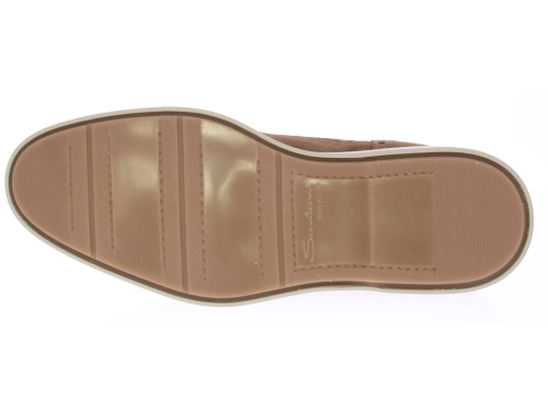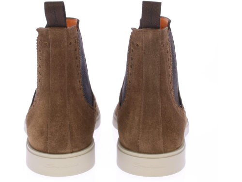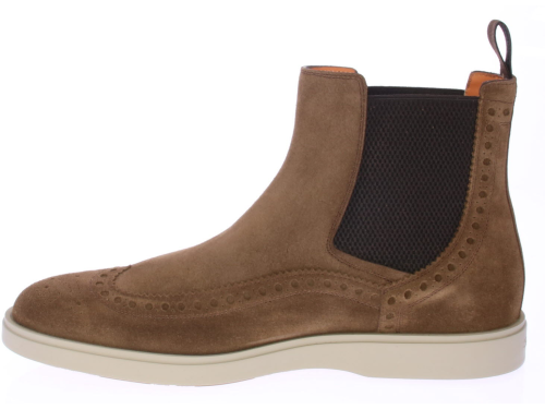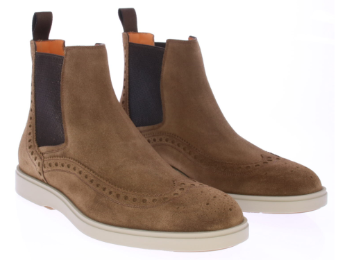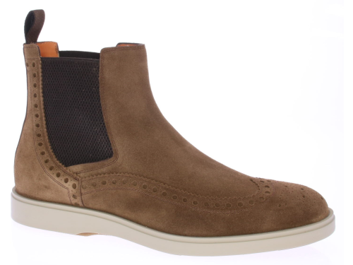 Bruine suede heren Chelseaboot van Santoni. De laars is uitgevoerd met brogue motief. De schoen is uitgevoerd in middelbruin suede en heeft een sportieve rubber zool. De voering is van leer.
