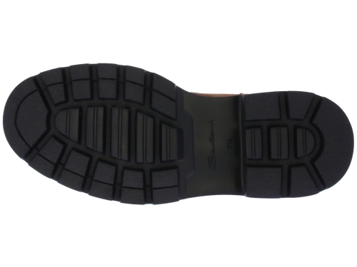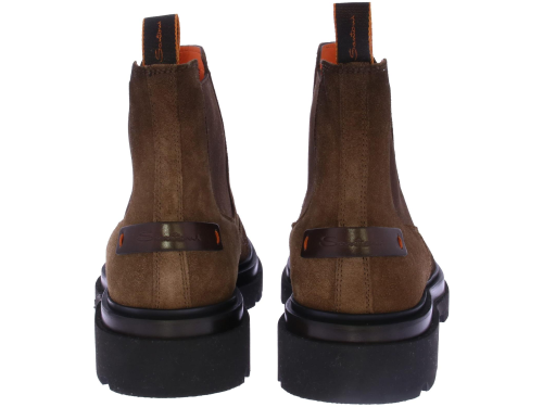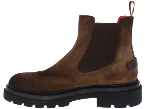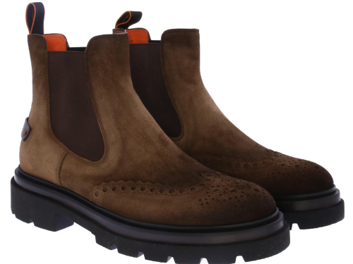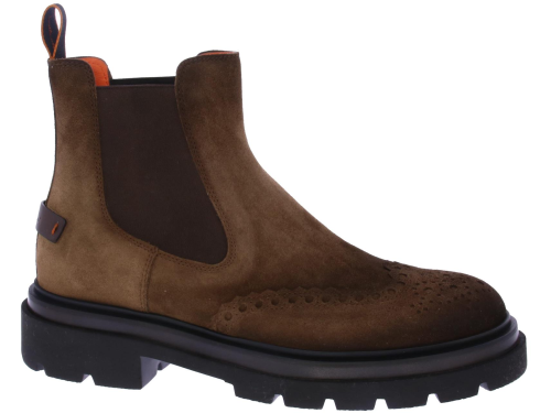Bruine suede heren Chelseaboot van Santoni. Deze Chelseaboot heeft een brogue motief over de neus lopen en heeft een leren binnen voering. De schoen komt op een groffe rubberen zool in dezelfde kleur als de rest van de schoen.