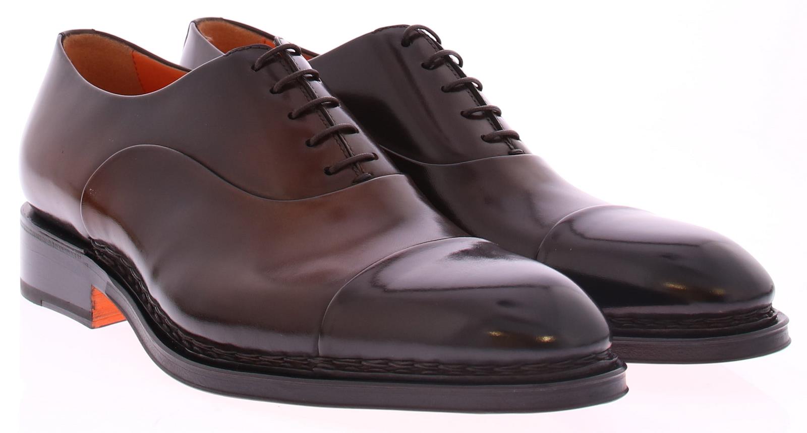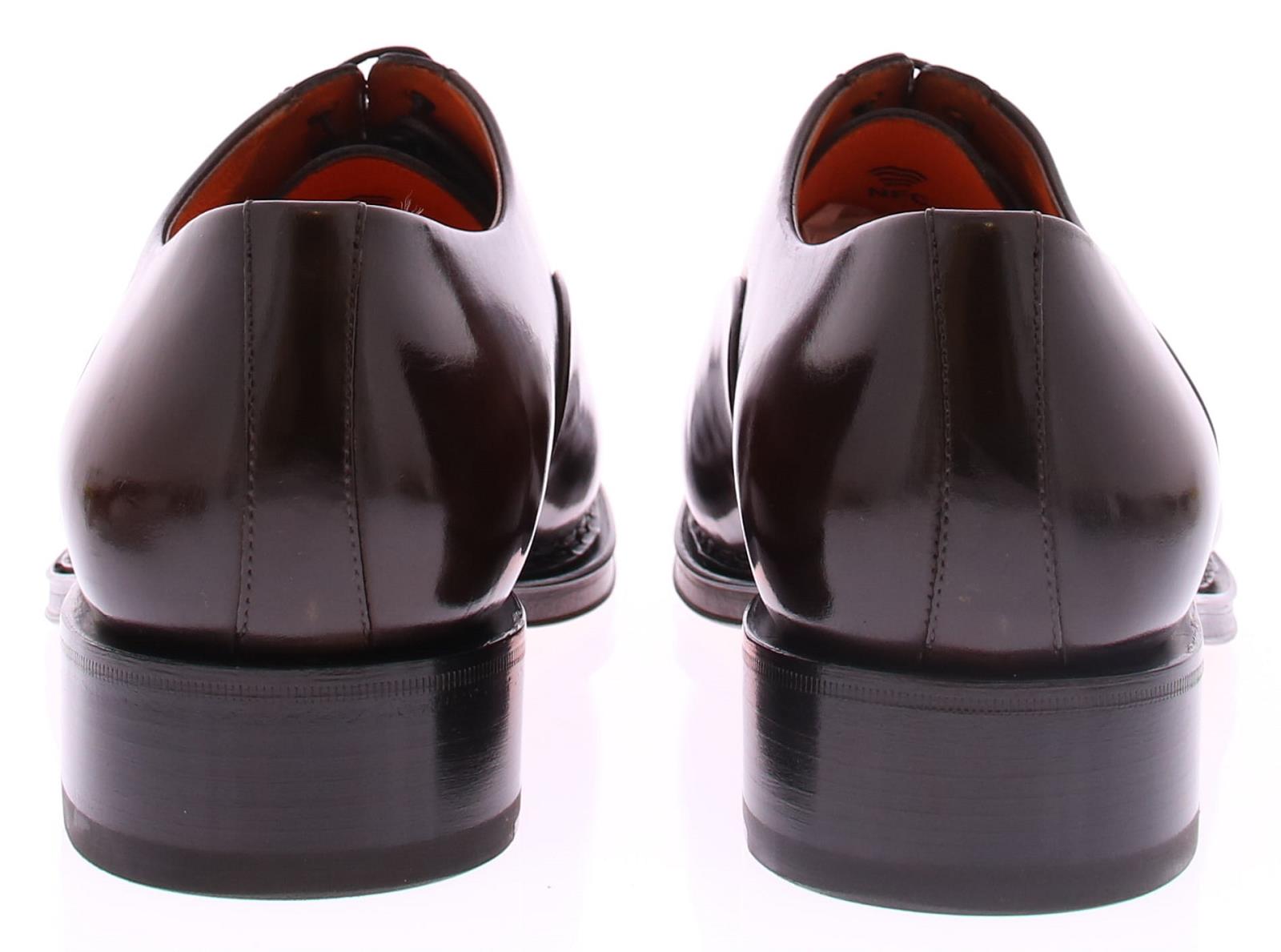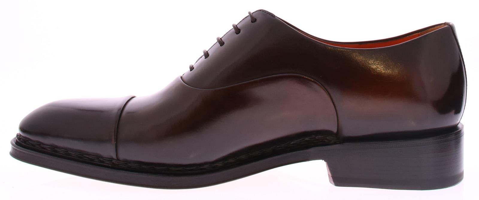 Bruine leren heren veterschoen van Santoni. Deze schoen komt op de Carter leest en heeft een neusnaad. De schoen heeft een handsteek naad rondom de voorkant, van hak tot hak. De schoen heeft een leren zool en voering en is gemaakt in een middenbruin kleur.