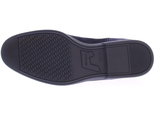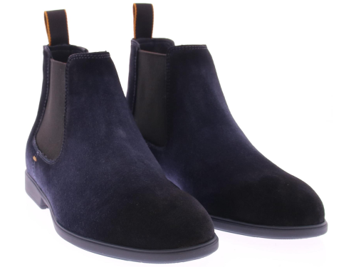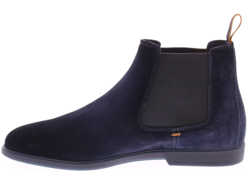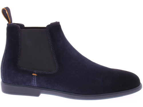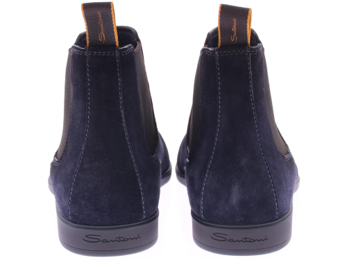 Donkerblauwe suède heren chelseaboot van Santoni. Kenmerkend zijn de elastische zij-inzetten en een treklus aan de achterkant, waardoor ze snel en gemakkelijk aan en uit te trekken zijn. Het ontwerp is afgewerkt met een lichte, flexibele rubberen zool voor optimale grip. De binnenzool is uitneembaar.