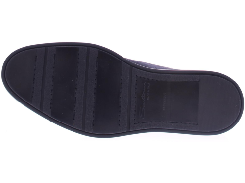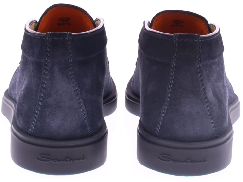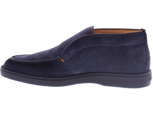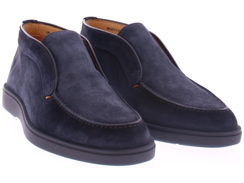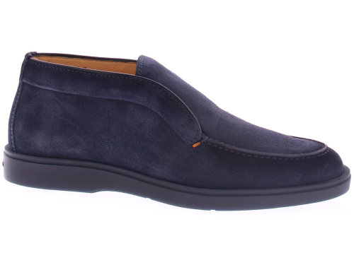 Donkerblauwe suède heren enkelboot van Santoni. Kenmerkend zijn de comfortabele ronde neus met zichtbare stiksels, ondersteund door een gladde, flexibele rubberen zool in dezelfde tint voor een moderne uitstraling.