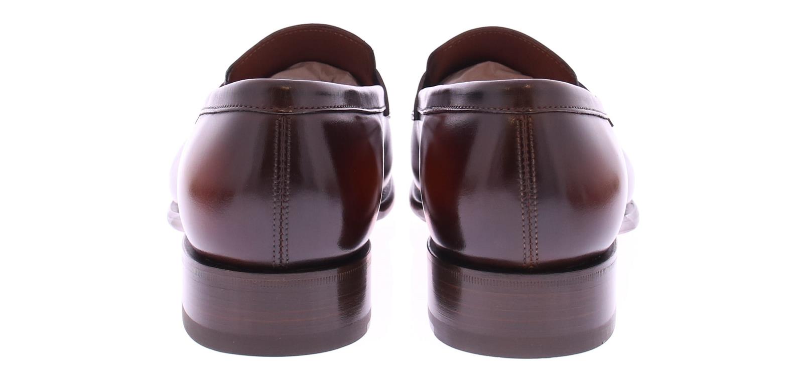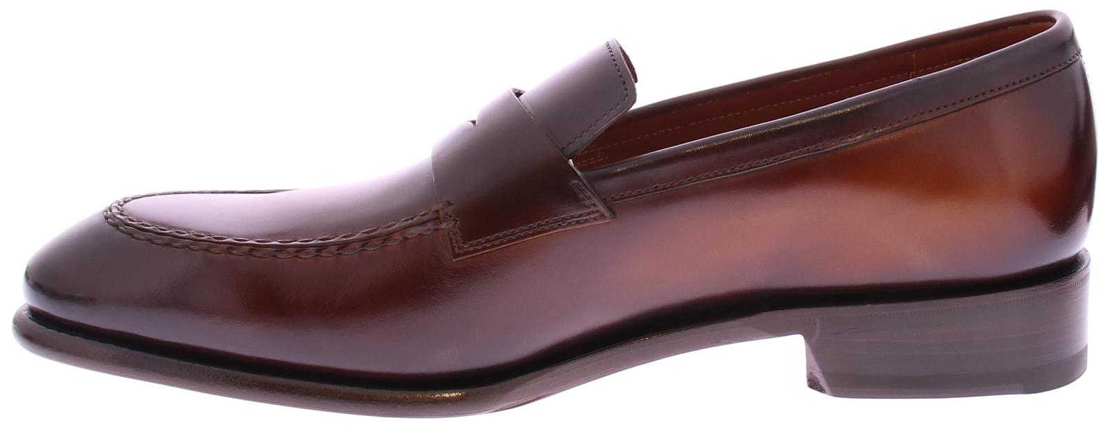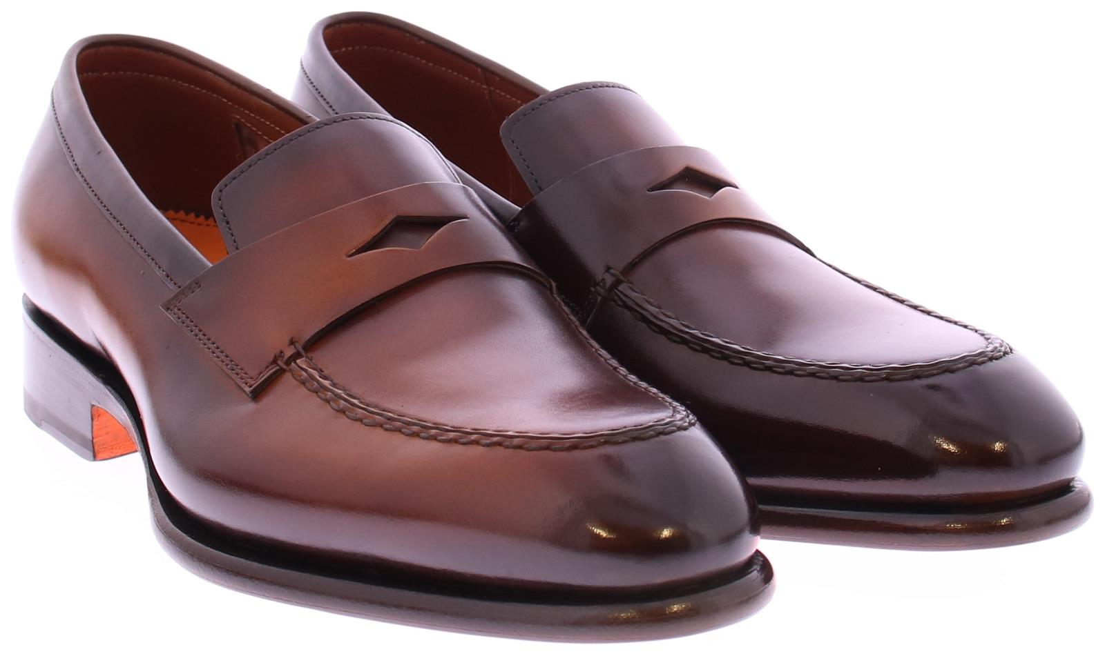 Cognackleurige leren heren loafer van Santoni. Deze luxe schoen is volledig met de hand gekleurd en komt op een leren zool. De binnenkant is van leer gemaakt en is voorzien van een vast voetbed. Deze schoen is goodyear gemaakt.