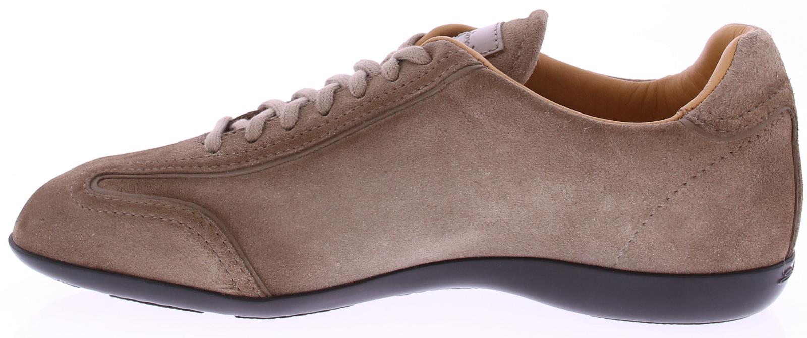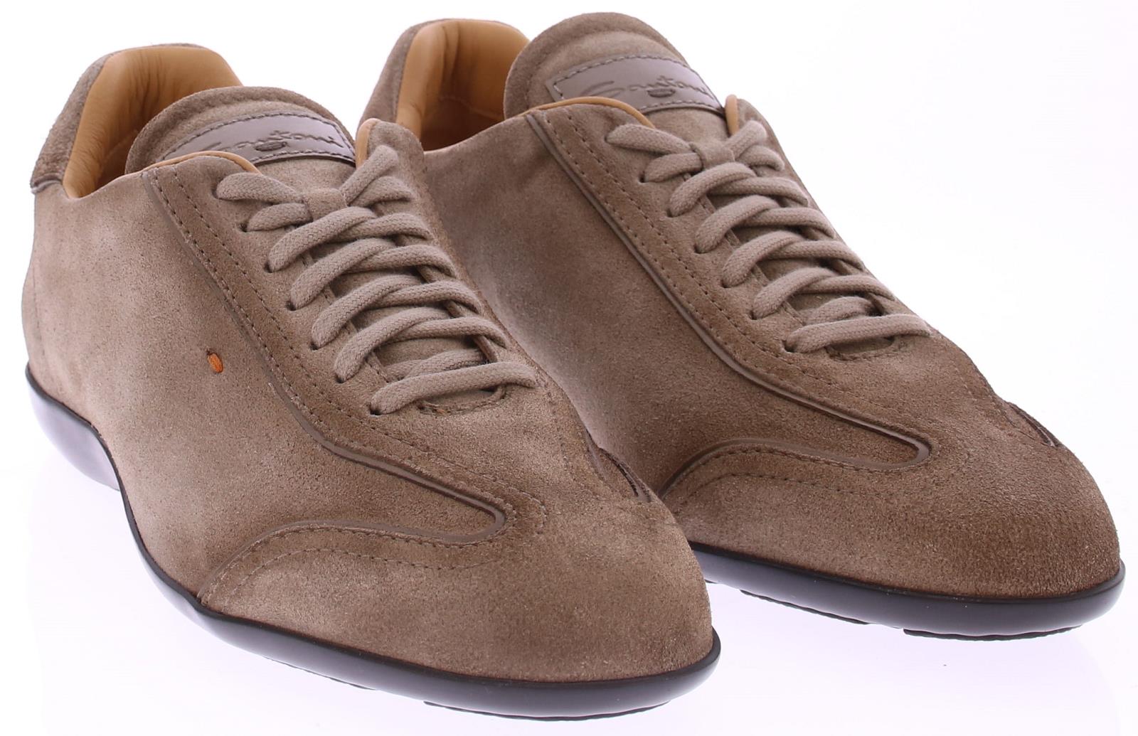 Santoni heren sneaker model Eagle met artikel MBEA14398DSKEBVNM45 uitgevoerd in taupe suède met een kalfsleren voering. De schoen heeft een los voetbed en zwarte rubber zool.