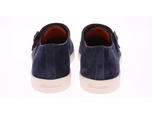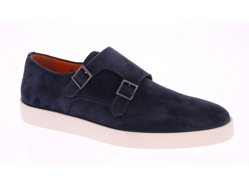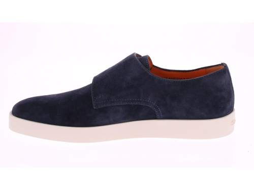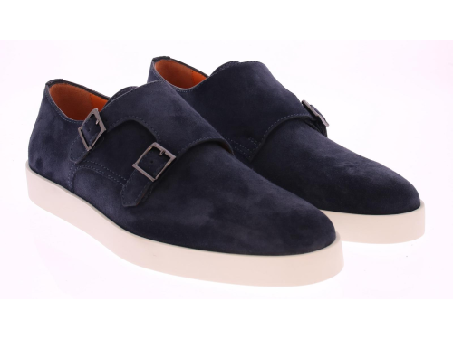 Santoni heren dubbel gespschoen model Bankable met artikel MGAI17832PANESVUU60 op sportieve wit rubber zool uitgevoerd in donker blauw suède. De schoen heeft een oranje voering en een los voetbed.Door een klassiek upper op een rubber zool te verwerken is deze schoen zowel goed casual als gekleed te dragen.