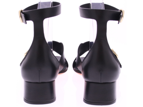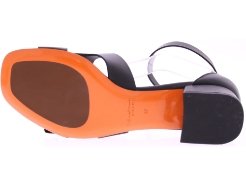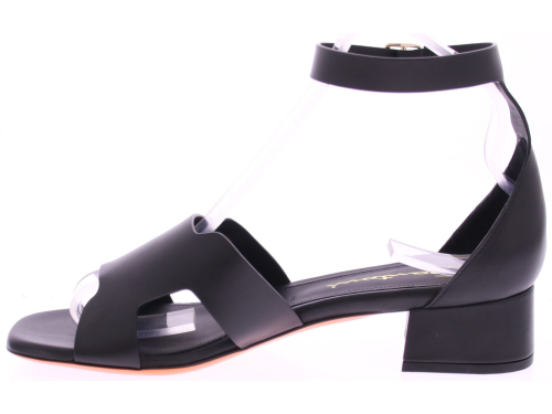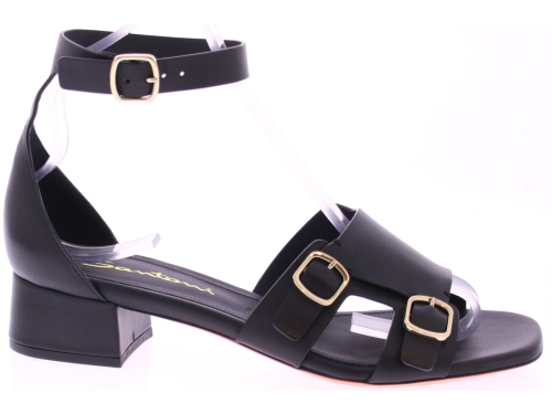 Deze elegante Santoni enkelband sandaal voor dames in zwart leer combineert luxe en comfort in een verfijnd ontwerp. Uitgevoerd in zwart leer straalt de schoen klasse uit. Het subtiel afgeronde voorblad is voorzien van de voor Santoni kenmerkende dubbele gespjes, verfijnd afgewerkt met hun subtiele logo. De zilverkleurige enkelgesp zorgt voor een perfecte pasvorm, terwijl de stevige blokhak van 3 cm een comfortabele lift biedt. Een tijdloos en stijlvol design, ideaal voor zowel formele als casual chique gelegenheden.