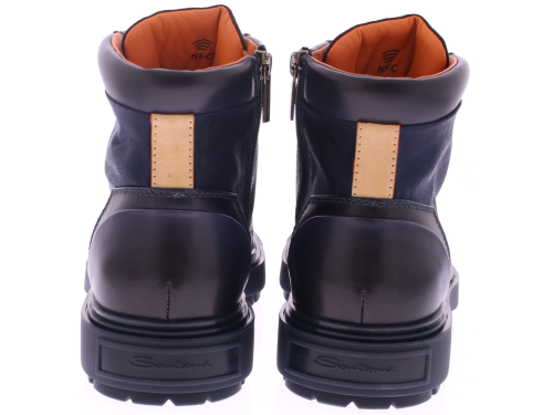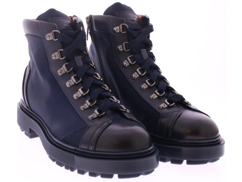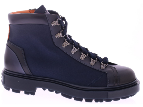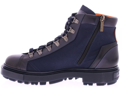 De Santoni St. Moritz 18190 is een moderne, sportieve high-top boot met een luxe twist. Gemaakt van een combinatie van donkerblauw leer en stevig canvas, en afgewerkt met een robuuste blauwe rubberzool. Dankzij de ritssluiting aan de zijkant is deze schoen niet alleen stijlvol maar ook bijzonder praktisch.