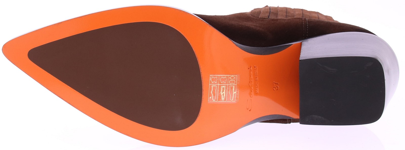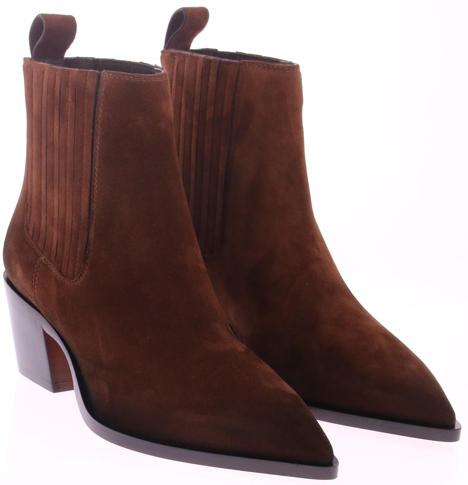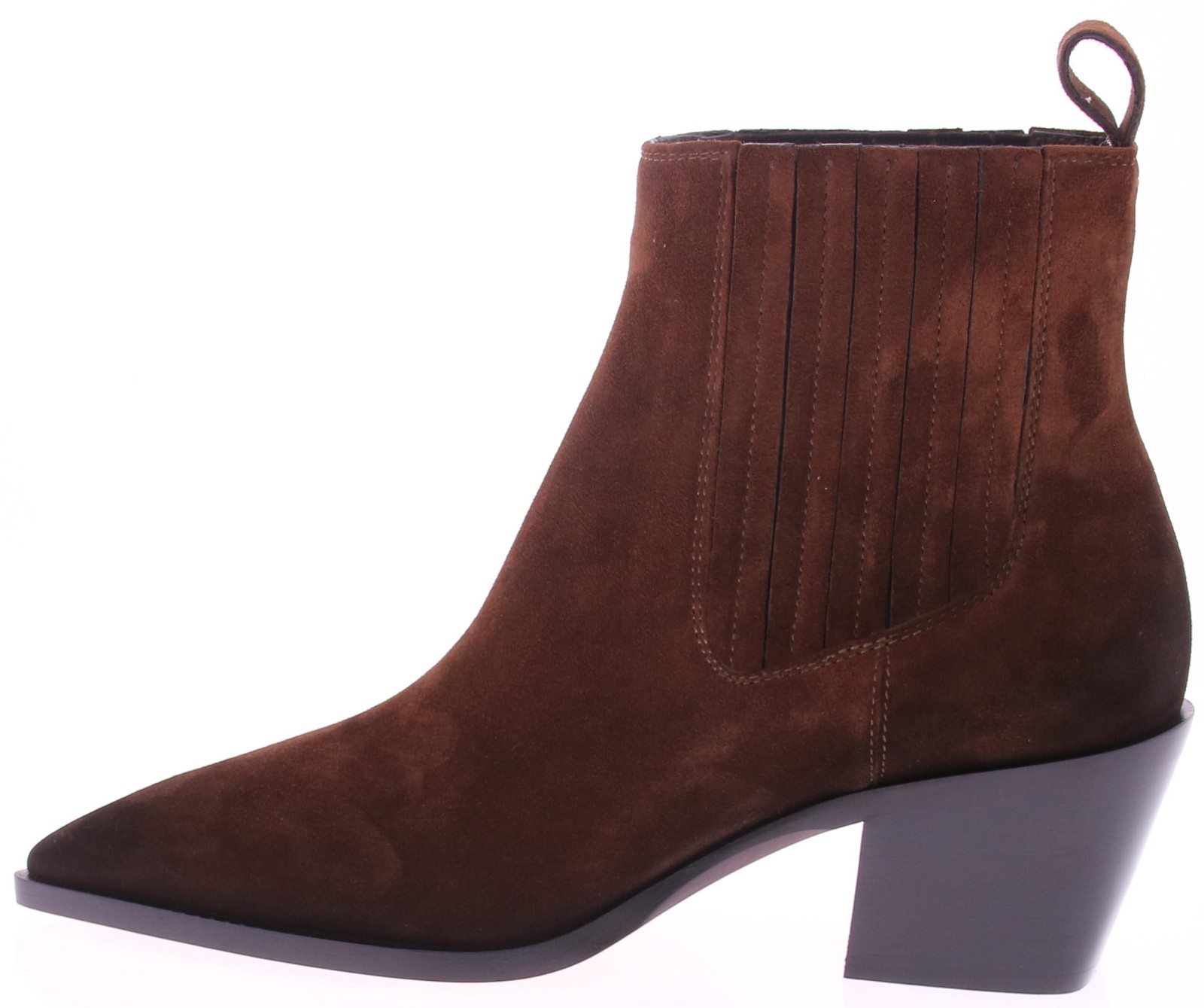 Bruin suède dames korte laars van Santoni, de 71799. Uitgevoerd in mooi luxe Italiaans suède op een spitse leest met een wat stoerdere hak van 5 cm. De elastieke inzetten aan de zijkanten zijn bekleed met suède. De zool is van leer met een rubberen inleg. Deze laars past perfect bij een jeans voor een casual look, maar komt ook tot zijn recht onder een nettere outfit. Tijdloos, stijlvol en met oog voor detail – Italiaans vakmanschap!!