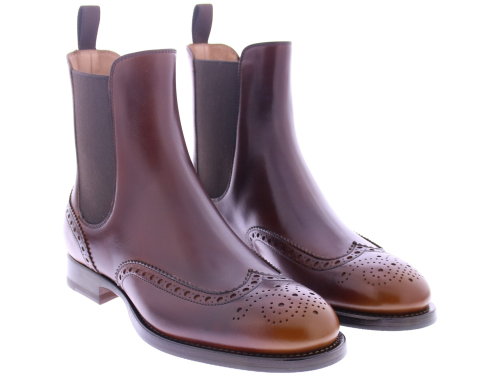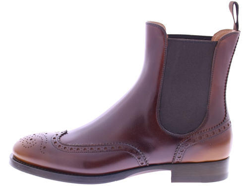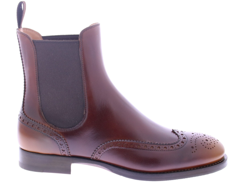 Middenbruin leren korte dames laars van Santoni. Deze Chelsea boot is met de hand gefinished wat mooie schaduweffecten geeft in het leer. De mooie ovale leest en klassieke uitstraling geeft hem een tijdloze look. De zool is van leer met een rubberen inleg en de voering is van leer.