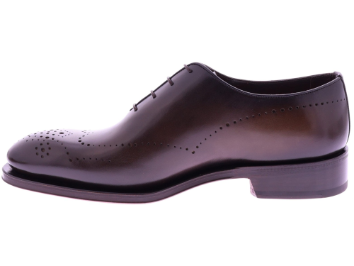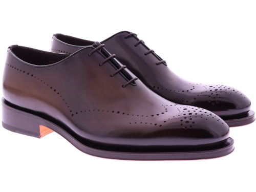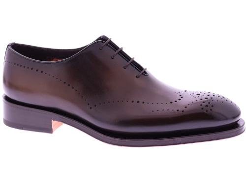 Bruine leren heren veterschoen van Santoni. Dit wholecut-model op de Carter leest is vervaardigd uit één stuk hoogwaardig leer en toont een verfijnde belijning met subtiele perforaties op de neus. De Goodyear-constructie biedt uitmuntende duurzaamheid en optimaal loopcomfort, terwijl de gepolijste finish zorgt voor een luxueuze, tijdloze uitstraling. Een perfecte keuze voor heren die klassieke elegantie en premium vakmanschap waarderen.