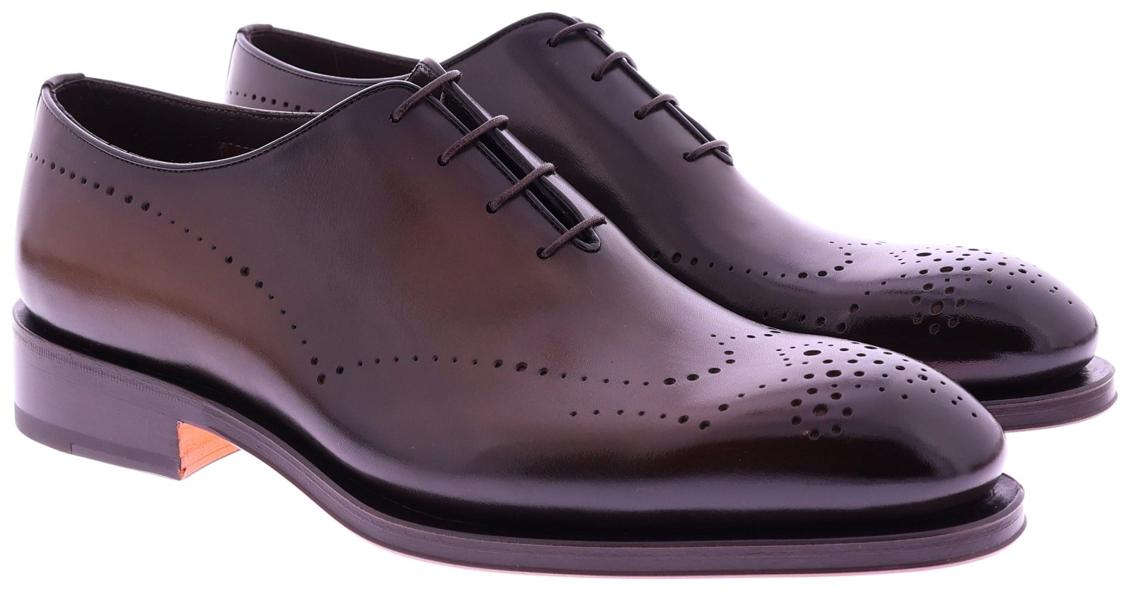 Bruine leren heren veterschoen van Santoni. Dit wholecut-model op de Carter leest is vervaardigd uit één stuk hoogwaardig leer en toont een verfijnde belijning met subtiele perforaties op de neus. De Goodyear-constructie biedt uitmuntende duurzaamheid en optimaal loopcomfort, terwijl de gepolijste finish zorgt voor een luxueuze, tijdloze uitstraling. Een perfecte keuze voor heren die klassieke elegantie en premium vakmanschap waarderen.