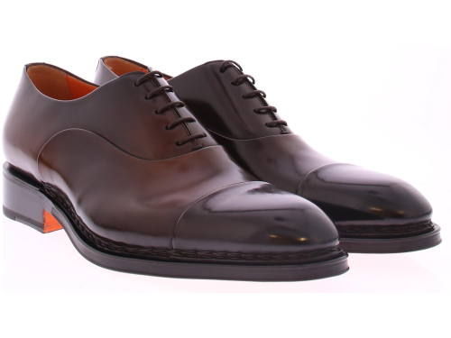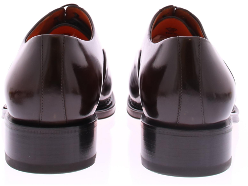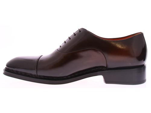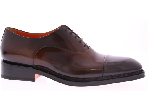 Bruine leren heren veterschoen van Santoni. Deze schoen komt op de Carter leest en heeft een neusnaad. De schoen heeft een handsteek naad rondom de voorkant, van hak tot hak. De schoen heeft een leren zool en voering en is gemaakt in een middenbruin kleur.