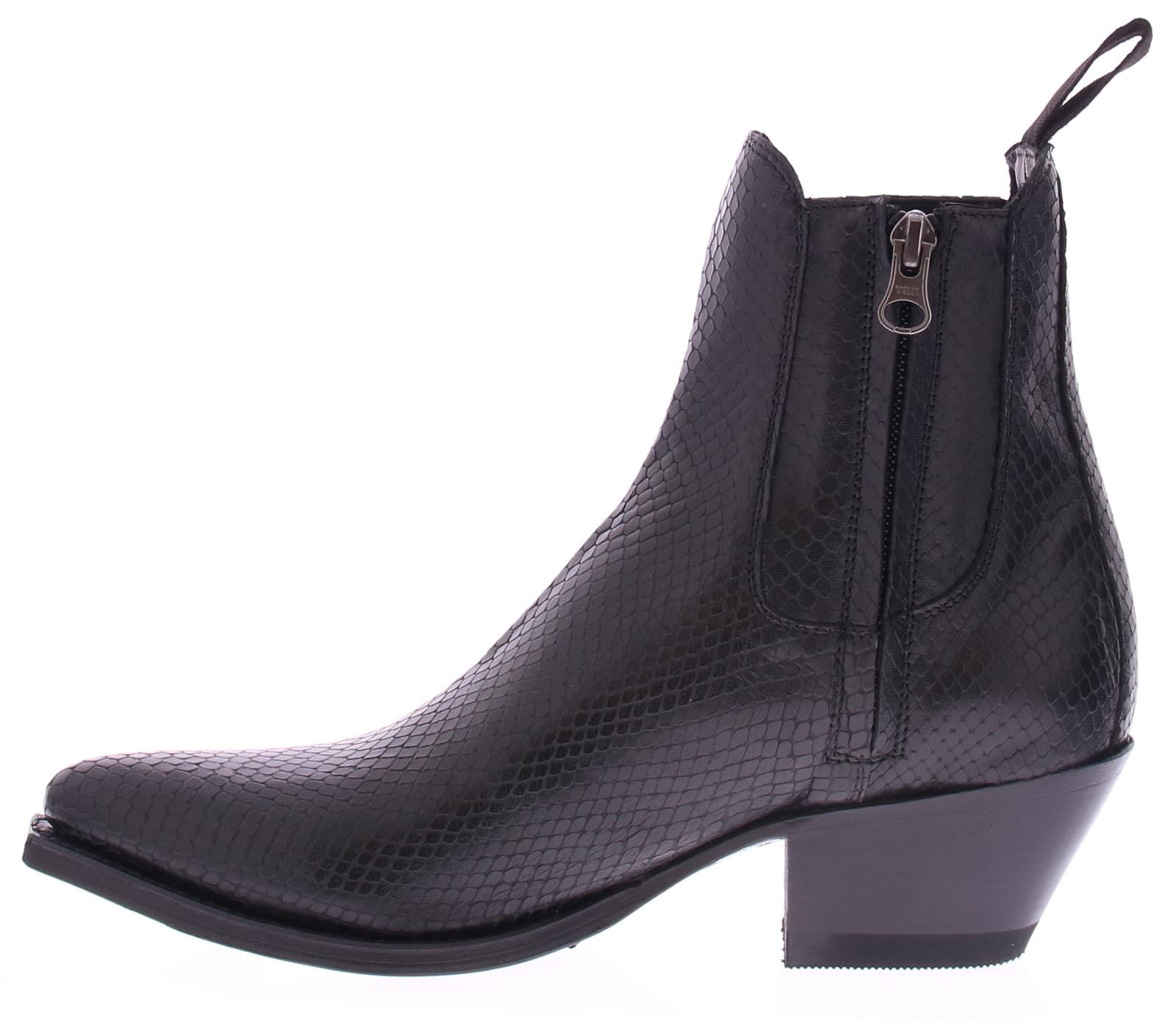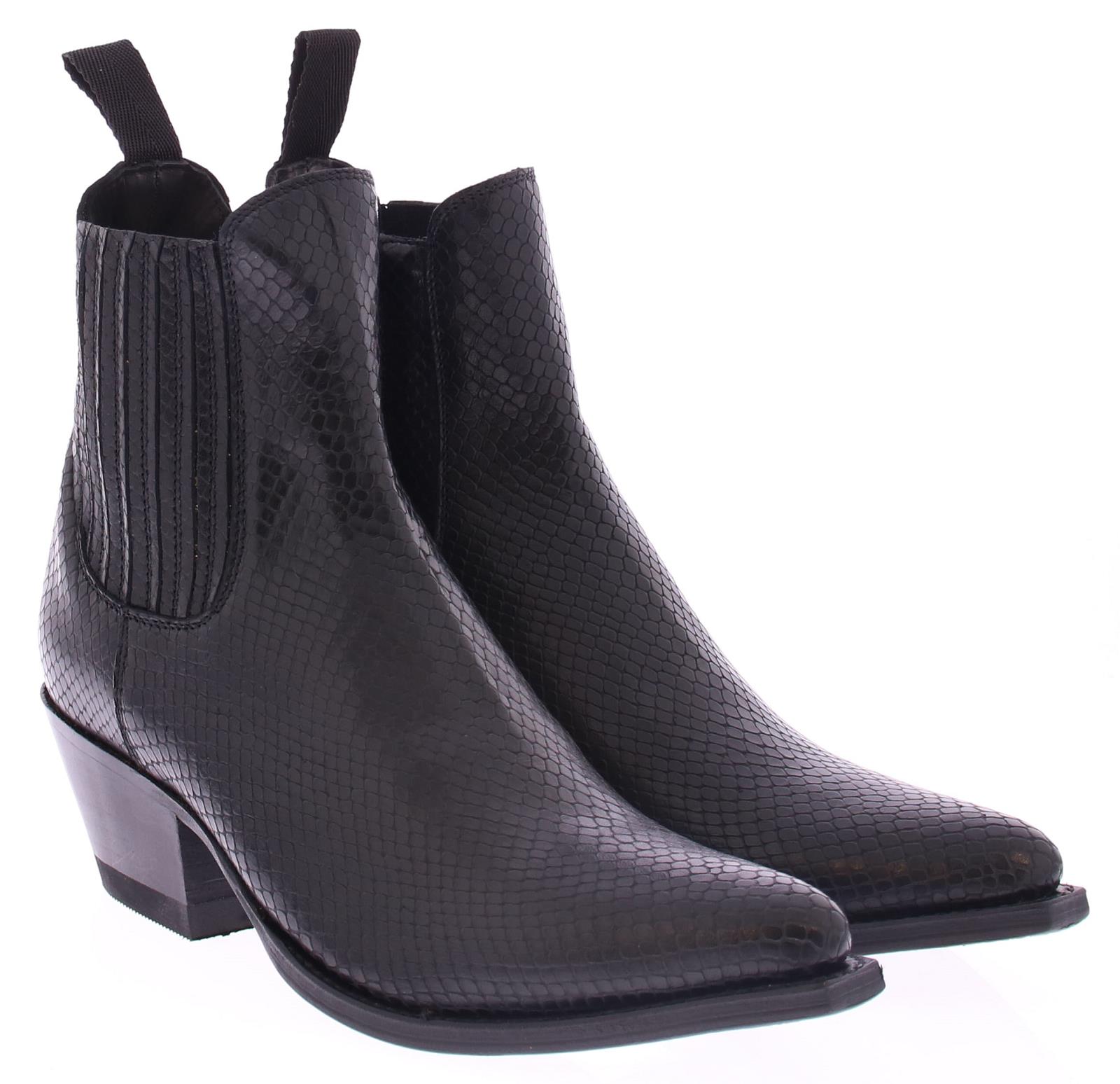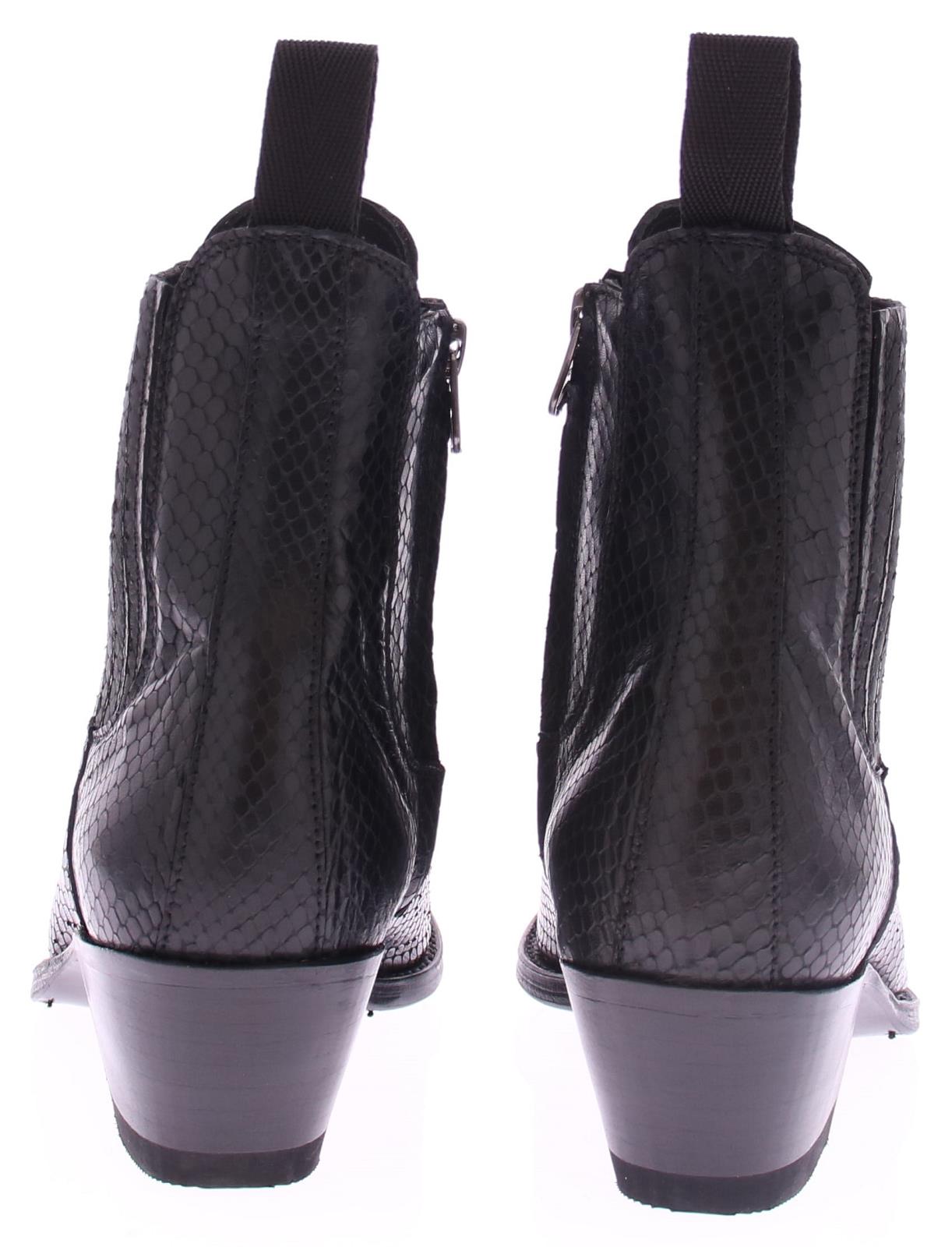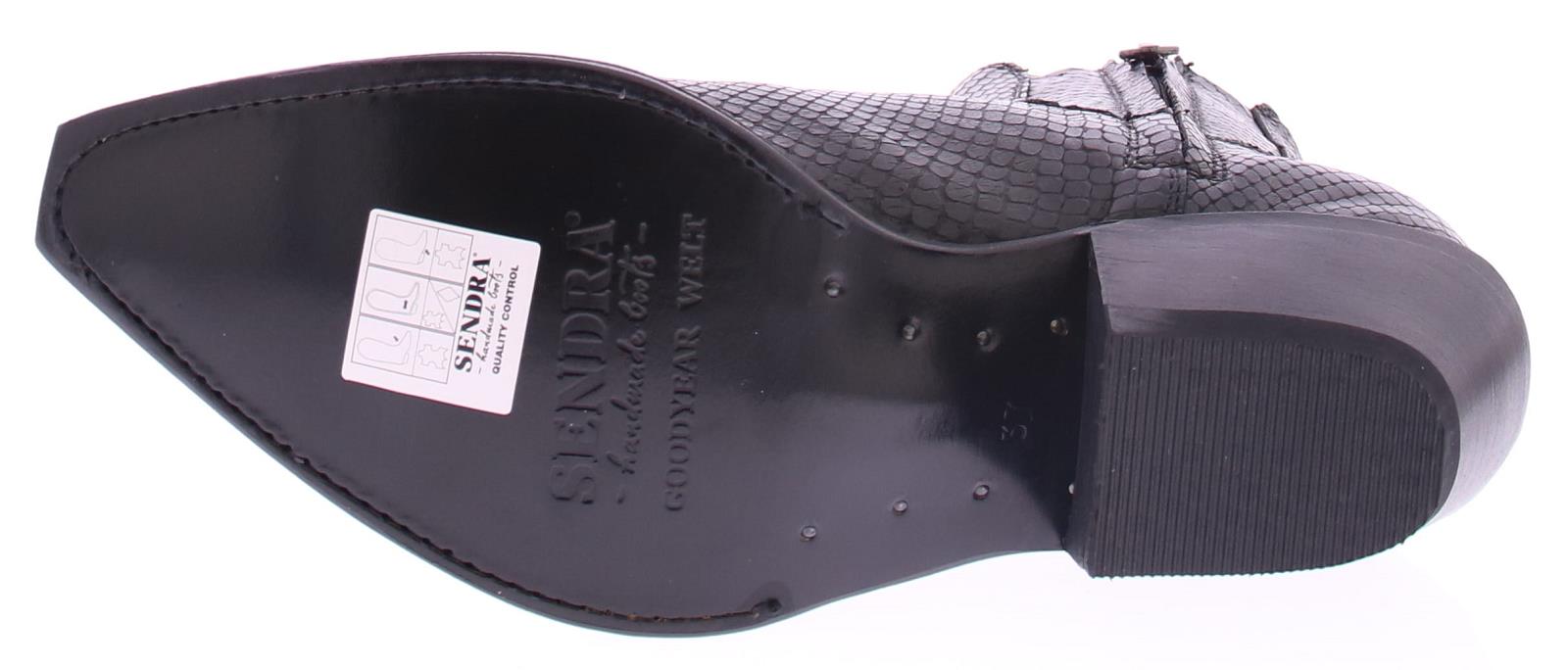 Zwart leren dames laars met slangenprint van Sendra. Dit korte laarsje heeft een rits en elastieke inzet voor het makkelijk aan en uit trekken. De schuine hak heeft een hoogte van 4 cm, en de zool is van leer.