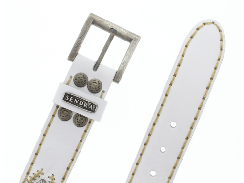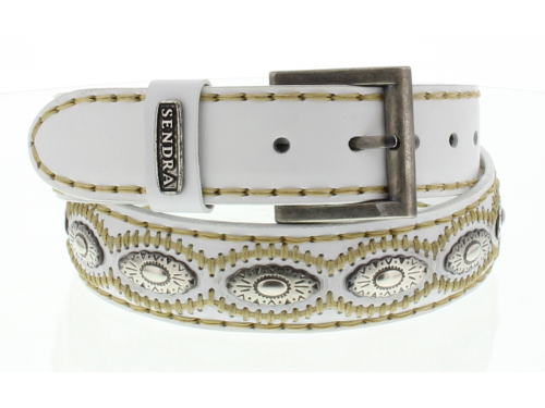 Witte leren riem van Sendra met zilveren concho's en witte stiksels. Sendra riemen worden met de hand gemaakt in Spanje en zijn in diverse lengte maten leverbaar. Deze riem kan niet ingekort worden